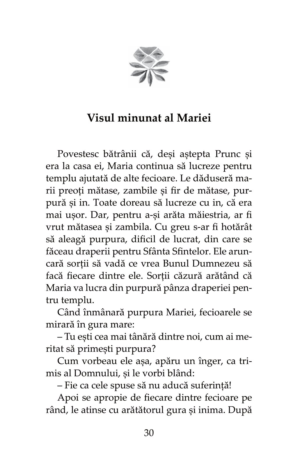Cartea de față ne propune câteva povestiri inspirate de poveștile din bătrâni, descoperindu-ne, pas cu pas, gingășia nesfârșită a vieții Maicii Domnului. Este un răstimp de care avem nevoie într-o lume tot mai lipsită de răbdare, dar grabnică în a oferi imaginației noastre lucuri mai puțin folositoare.