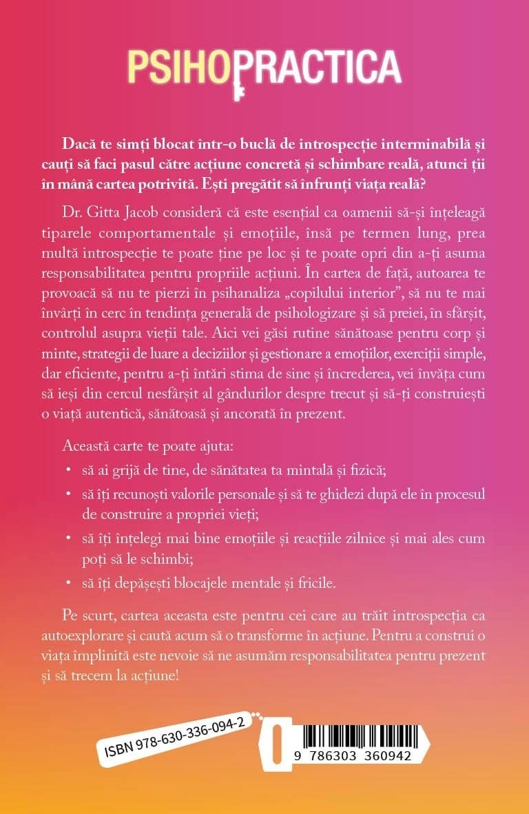 Aceasta carte ofera o perspectiva lucida asupra limitelor autoanalizei si deschide calea catre un mod de a trai mai activ si mai constient. Volumul detaliaza o abordare directa si practica a dezvoltarii personale: cum sa inveti sa iti gestionezi emotiile fara sa devii prizonierul lor, sa transformi nesiguranta in curaj si sa construiesti un fundament solid pentru viata ta din prezent si pentru viitorul tau. Prin reflectii clare, exemple pline de inspiratie si exercitii usor de pus in aplicare, Gitta Jacob ofera un ghid de psihologie pragmatica, menit sa te ajute sa treci de la introspectie la actiune pentru a-ti crea viata pe care o doresti.