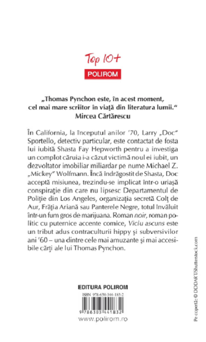 Încă îndrăgostit de Shasta, Doc acceptă misiunea, trezindu-se implicat într-o uriaşă conspiraţie din care nu lipsesc Departamentul de Poliţie din Los Angeles, organizaţia secretă Colţ de Aur, Frăţia Ariană sau Panterele Negre, totul învăluit într-un fum gros de marijuana. Roman noir, roman politic cu puternice accente comice, Viciu ascuns este un tribut adus contraculturii hippy şi subversivilor ani ’60 – una dintre cele mai amuzante şi mai accesibile cărţi ale lui Thomas Pynchon.