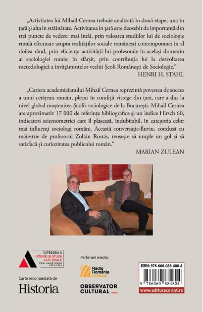 „Cariera academicianului Mihail Cernea reprezintă povestea de succes a unui cetățean român, plecat în condiții vitrege din țară, care a dus la nivel global moștenirea Școlii sociologice de la București. Mihail Cernea are aproximativ 17 000 de referințe bibliografice și un indice Hirsch 60, indicatori scientometrici care îl plasează, indubitabil, în categoria celor mai influenți sociologi români. Această conversație-fluviu, condusă cu măiestrie de profesorul Zoltan Rostás, reușește să umple un gol și să satisfacă și curiozitatea publicului român.” MARIAN ZULEAN