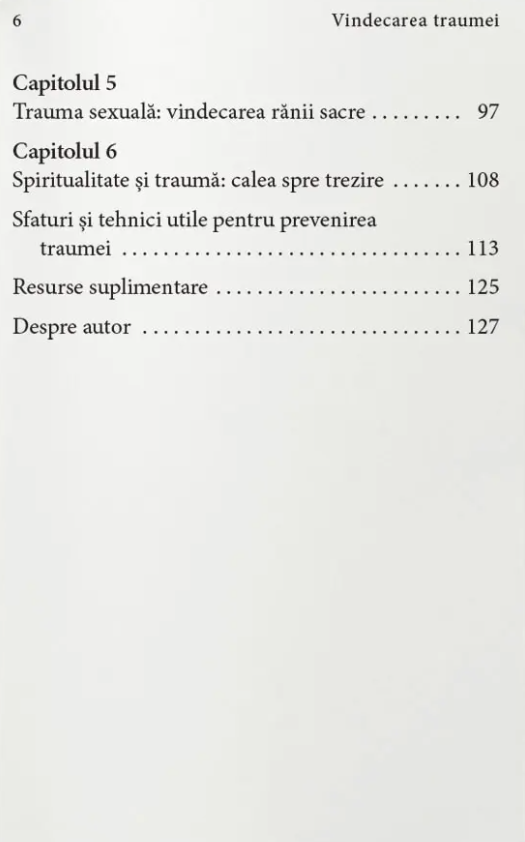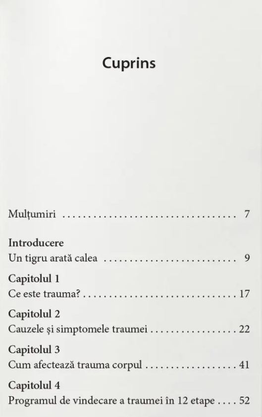 Alătură-te autorului ca să descoperi: cum să-ți dezvolți o conștientizare corporală pentru a „renegocia“ și a vindeca traume, „revizitându-le“, iar nu retrăindu-le; măsuri „de prim ajutor“ de urgență pentru momente de dezastru; și lecții luate din natură pentru descoperirea rădăcinilor psihologice ale emoțiilor tale.