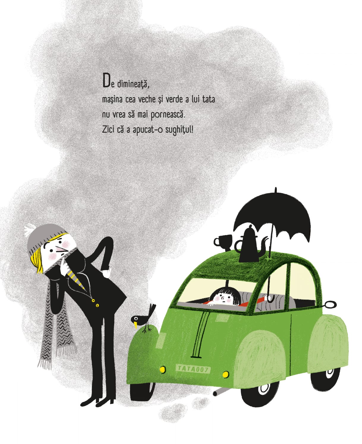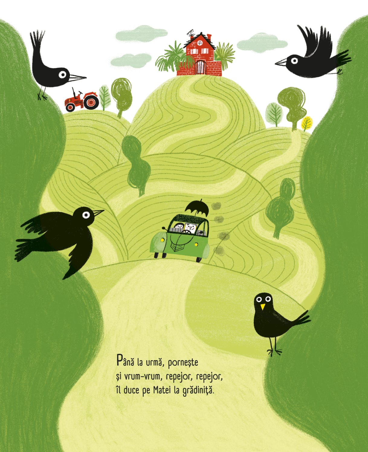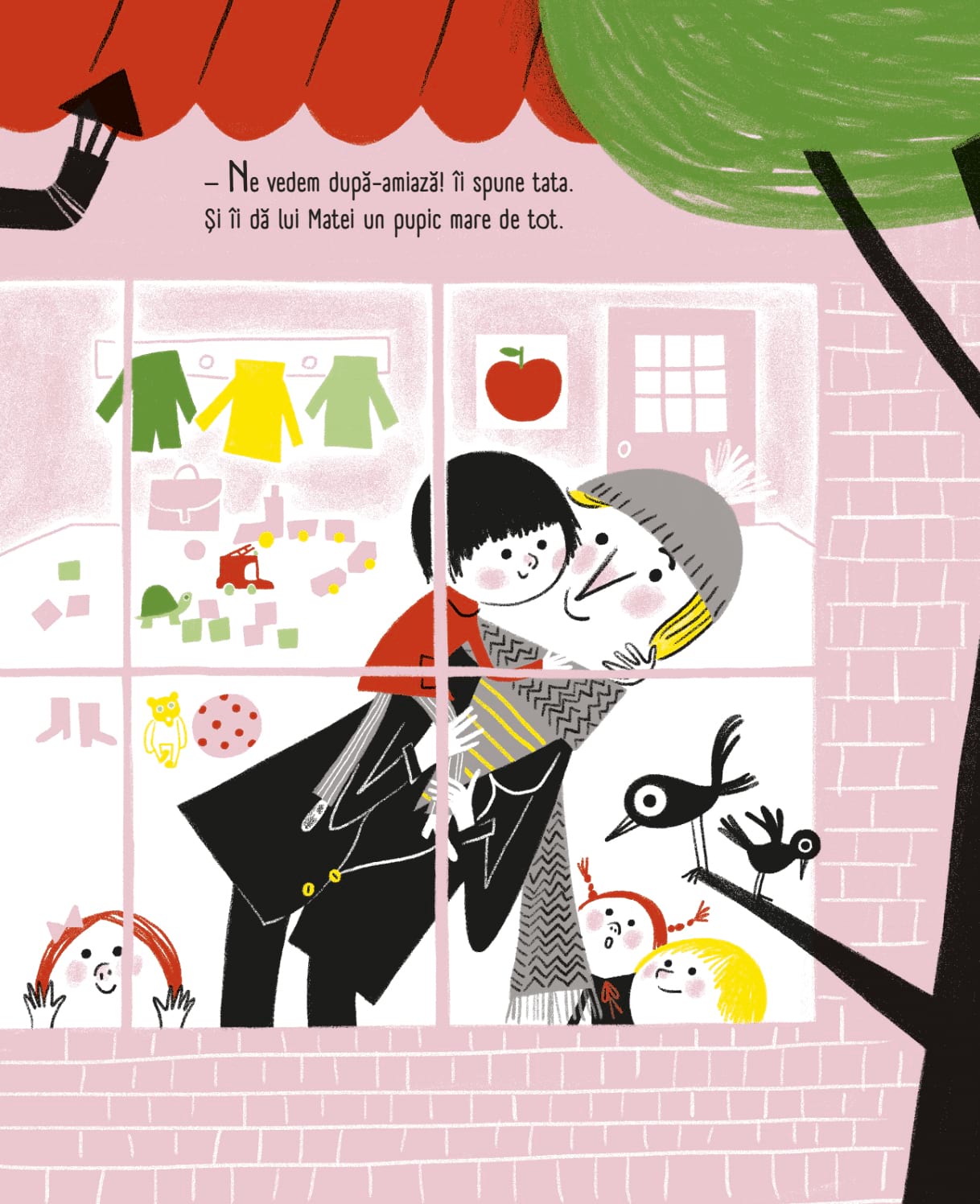 Dialogul dintre tata și Matei este un splendid exemplu de pricepere părintească de a insufla încredere, siguranță și iubire copilului copleșit de anxietatea despărțirii. Tata le ia drept martori pe toate personajele reale sau ficționale care îi sunt familiare copilului: vecinul, ursul de pluș, iepurașii, păsările din curte, dragonul din povești… Pentru că, dacă se strică mașina, tata vine cu tractorul, cu barca, pe aripi de pasăre, pe picioare de iepurași, pe spinare de urs, călare pe dragoni sau pur și simplu pe jos, cu pașii lui de uriaș.