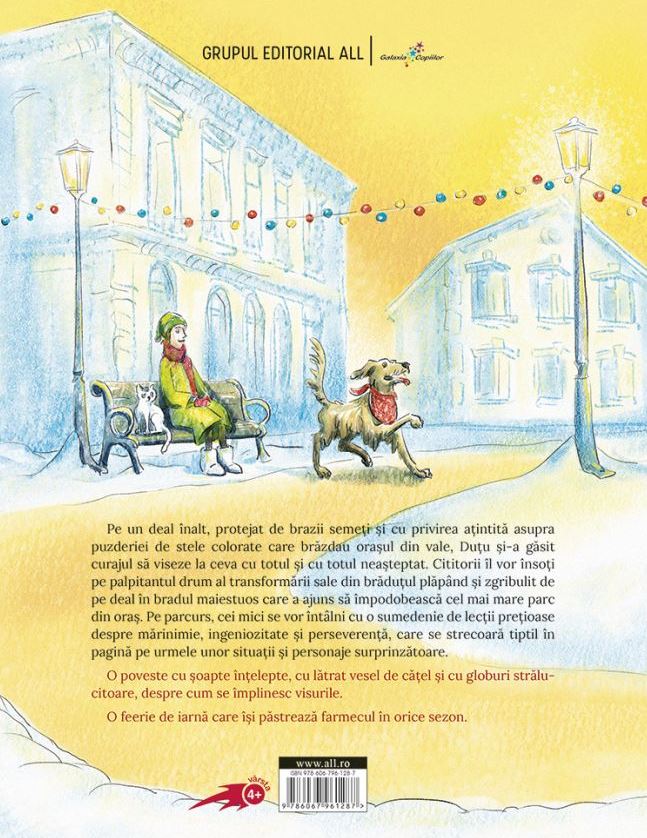 Pe un deal înalt, protejat de brazii semeți și cu privirea ațintită asupra puzderiei de stele colorate care brăzdau orașul din vale, Duțu și-a găsit curajul să viseze la ceva cu totul și cu totul neașteptat. Cititorii îl vor însoți pe palpitantul drum al transformării sale din brăduțul plăpând și zgribulit de pe deal în bradul maiestuos care a ajuns să împodobească cel mai mare parc din oraș.