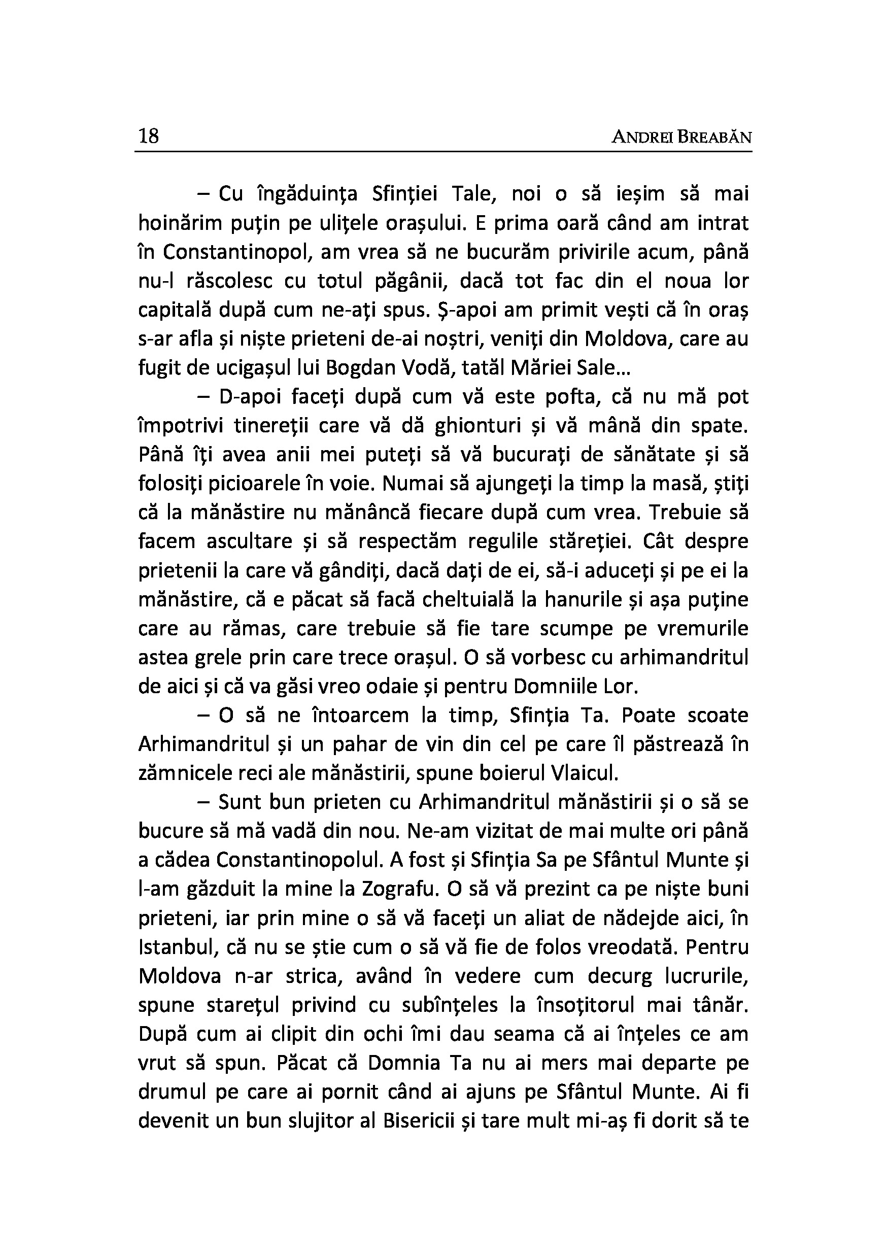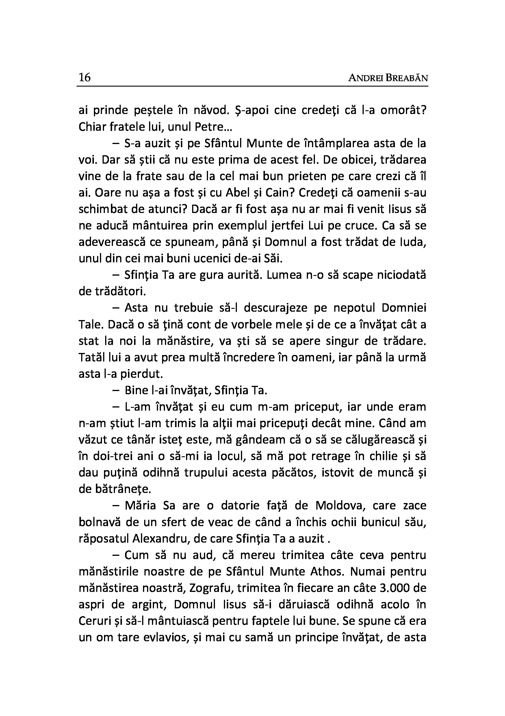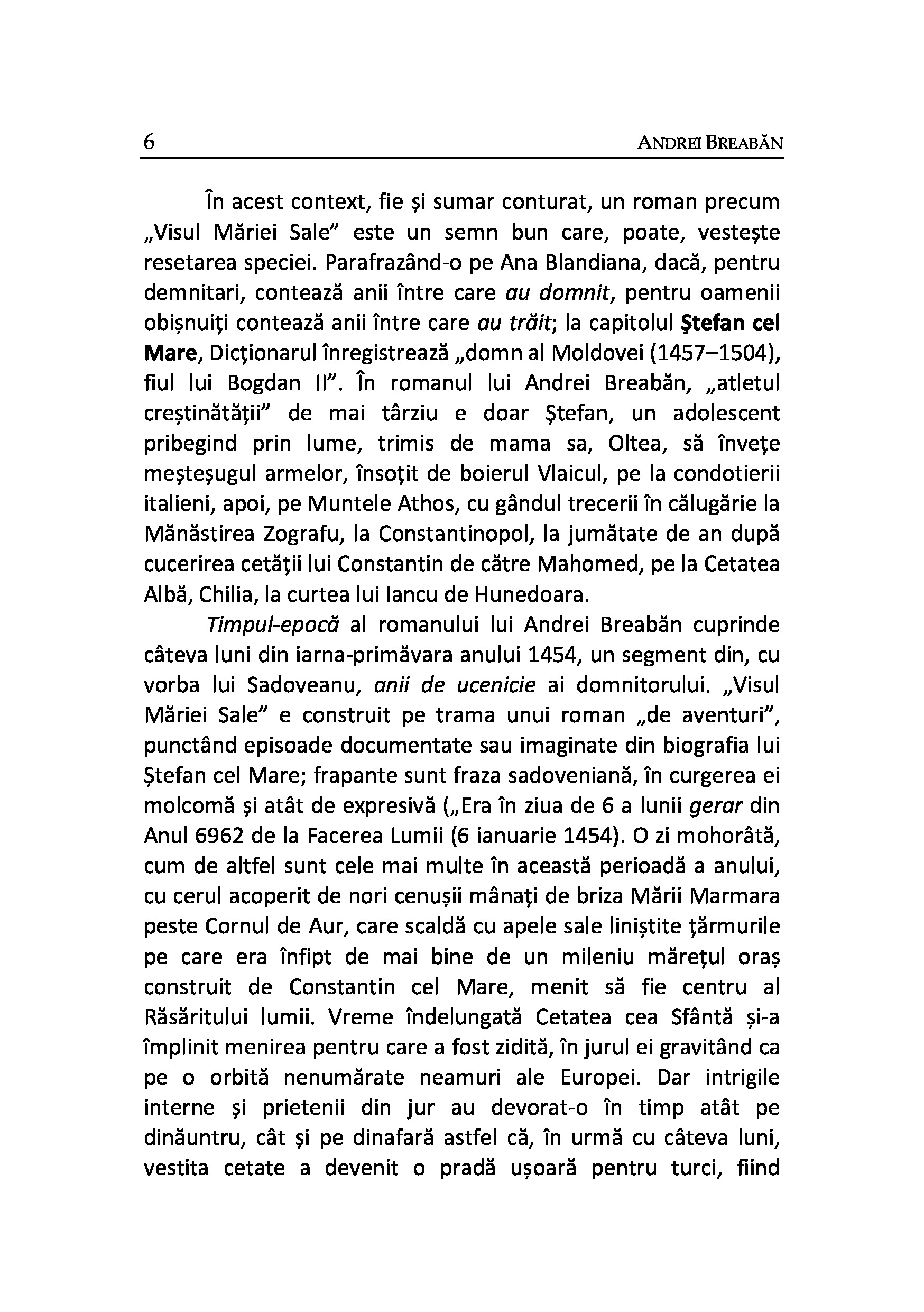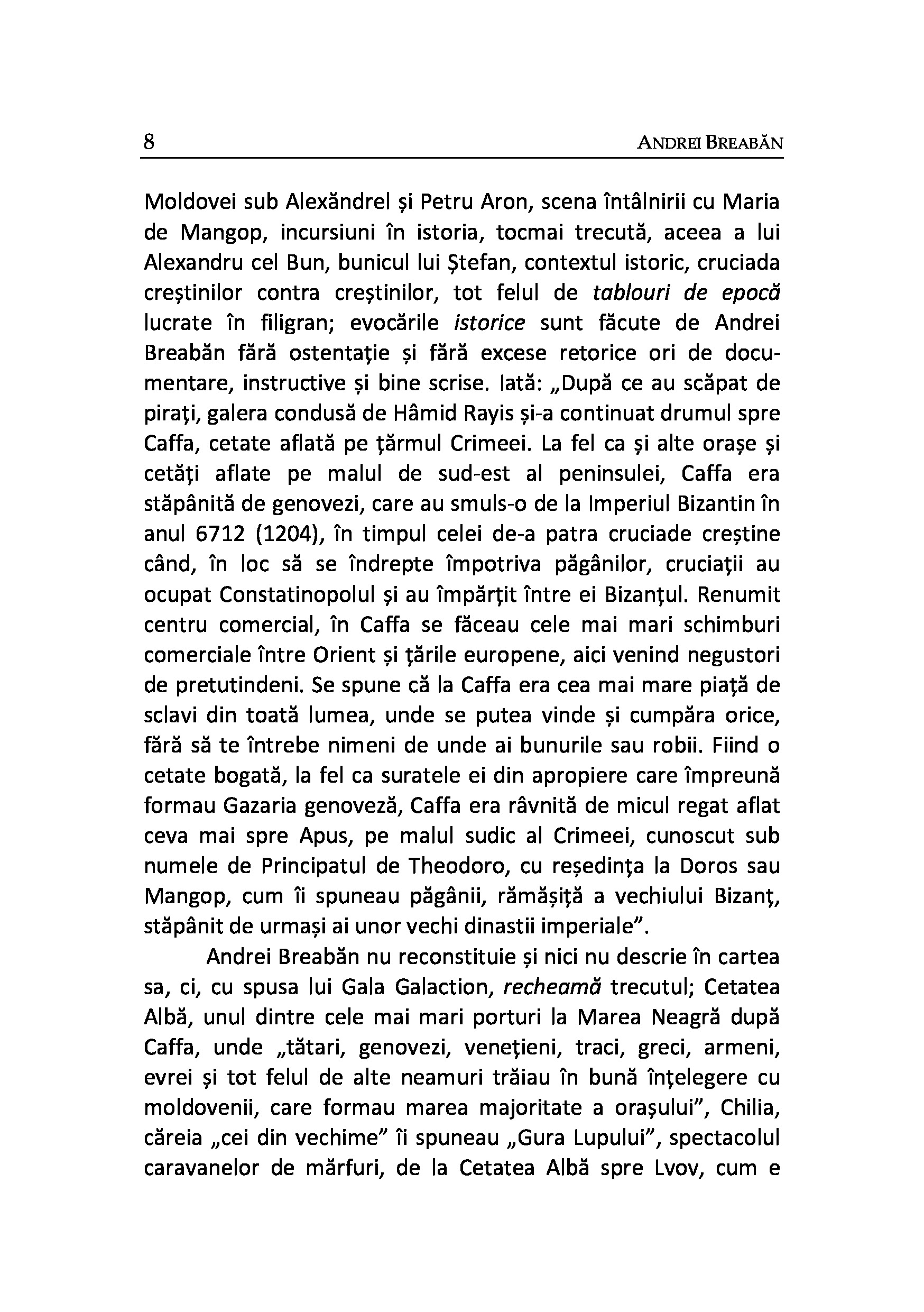 Andrei Breaban nu reconstituie si nici nu descrie in cartea sa, ci, cu spusa lui Gala Galaction, recheama trecutul; Cetatea Alba, unul dintre cele mai mari porturi la Marea Neagra dupa Caffa, unde "tatari, genovezi, venetieni, traci, greci, armeni, evrei si tot felul de alte neamuri traiau in buna intelegere cu moldovenii, care formau marea majoritate a orasului", Chilia, careia "cei din vechime" ii spuneau "Gura Lupului", spectacolul caravanelor de marfuri, de la Cetatea Alba spre Lvov, cum e aceea a lui Gica al lui Chioru, masa la un negustor din Kalamita, care "pune sa se taie in cinstea venirii lor doi porci si doi vitei de un an; dupa ce ii frige in curte, la jar, aduce la masa un vin rosu si gustos, proasp at scos de la zamnicele imp aratesti", tablouri impre-sionante de epoca, cum e acela al lui Iancu de Hunedoara langa Stefan al Moldovei desenate, in emotie autentica, bine strunita insa, dar, mai cu seama, portretele bine facute, pastrand detaliul psihologic si culoarea epocii, fiind un adevarat vehicul al acesteia: se retin, in aceasta ordine, portretele staretului de la Manastirea Zografu, al lui Vlad Drago, fratele de cruce al lui Stefan ori al Doamnei Oltea, mama lui Stefan cel Mare, venind, in proza lui Andrei Breaban, cu imaginea dintr-un celebru poem: Cetatea Neamtului e, aici, castelul lui Iancu de Hunedoara.