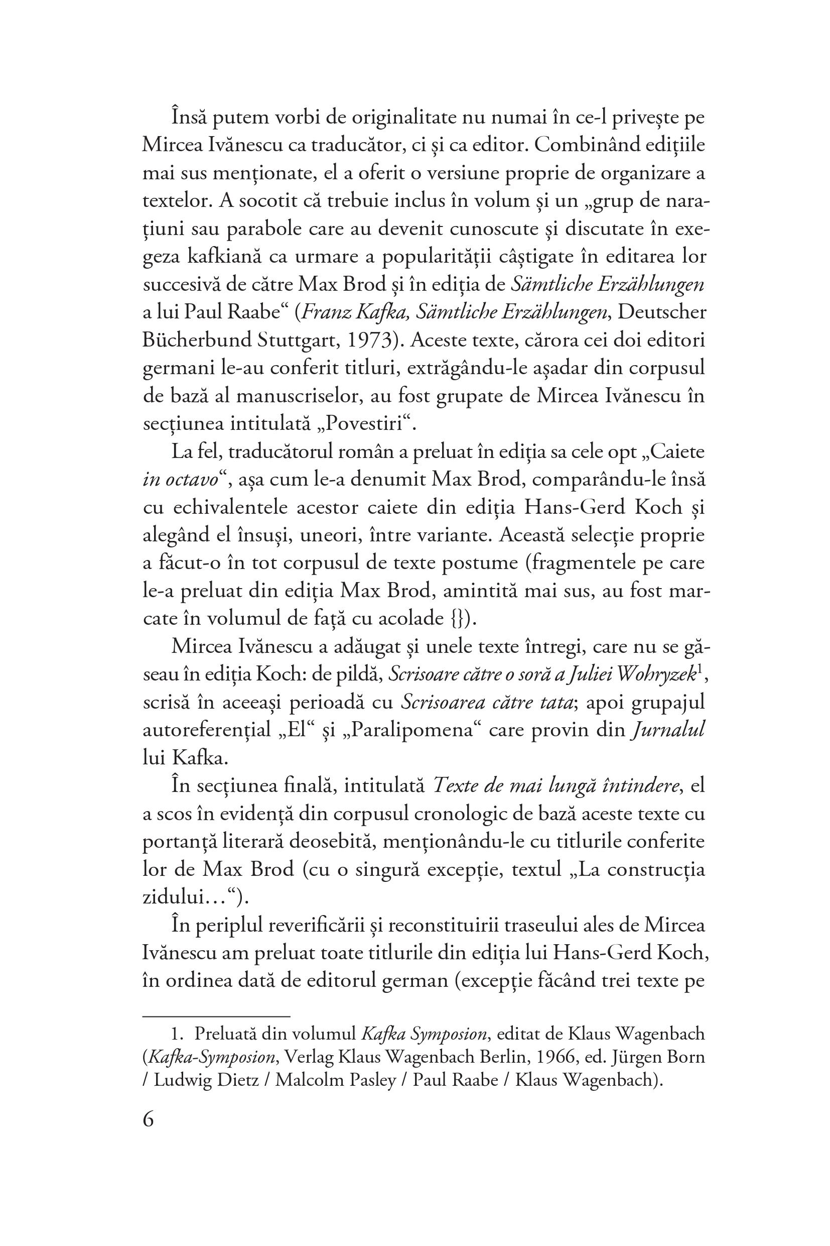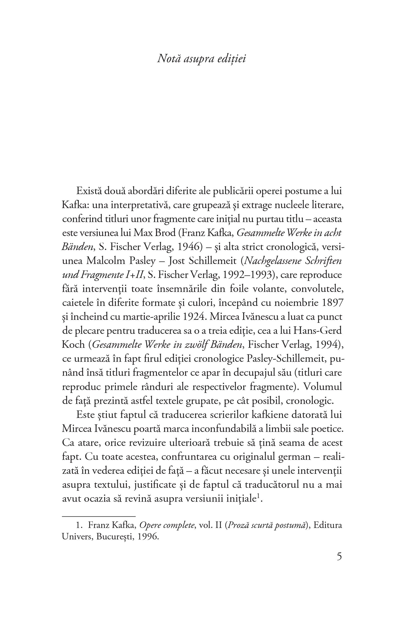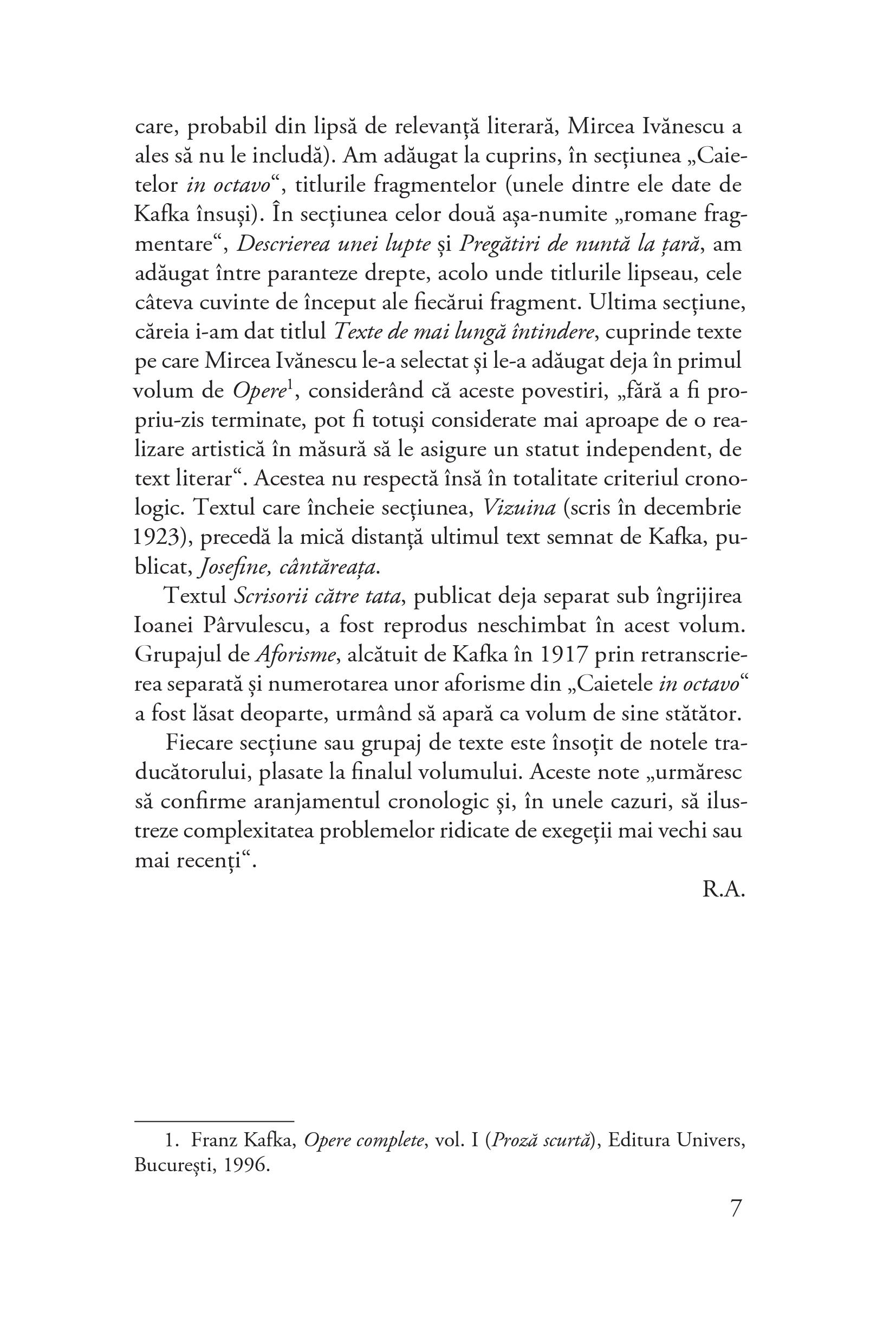 „Tot ce a scris Kafka, indiferent dacă s-a publicat sau nu în timpul vieții sale, este la același nivel de teroare și iluminare, dincolo de posibilitățile minții omenești. Ca să-l poți înțelege, trebuie ca tu însuți să fii dispus să pără­sești o lume a confortului intelectual și moral pentru un sistem carstic de o infinită măreție. Nici un autor nu răsplătește sacrificiile cititorului ca Franz Kafka. El îți cere să părăsești tot ce este omenesc ca să te-ntorci din nou spre uman, la capătul unei aventuri totale, înveșmântat în veșmintele celui înviat din morți.“ – MIRCEA CĂRTĂRESCU