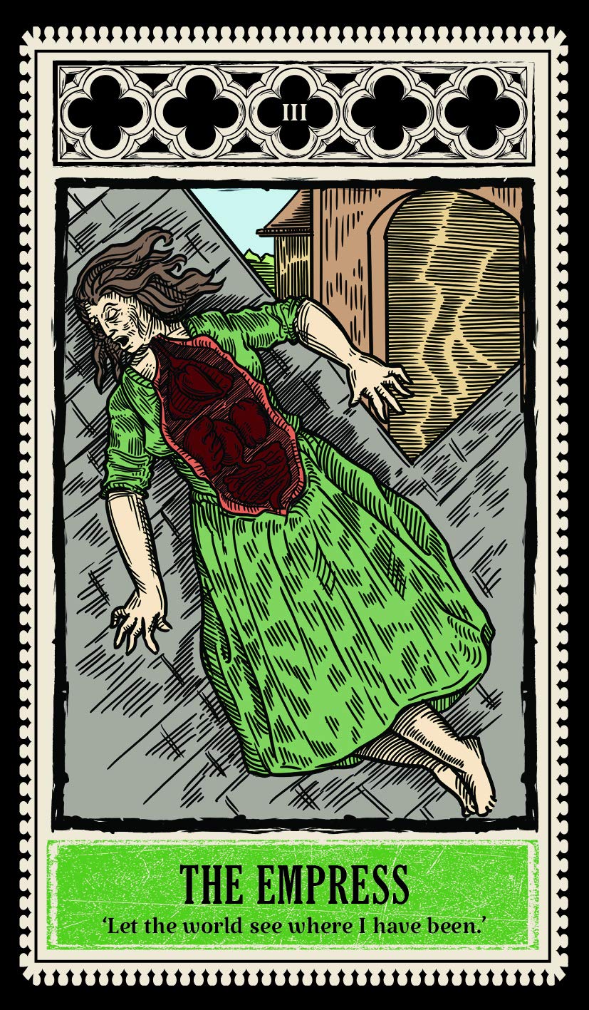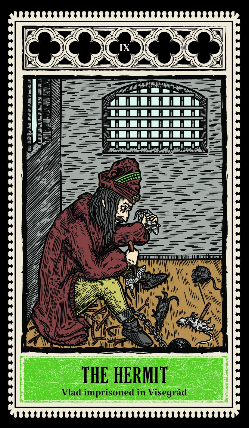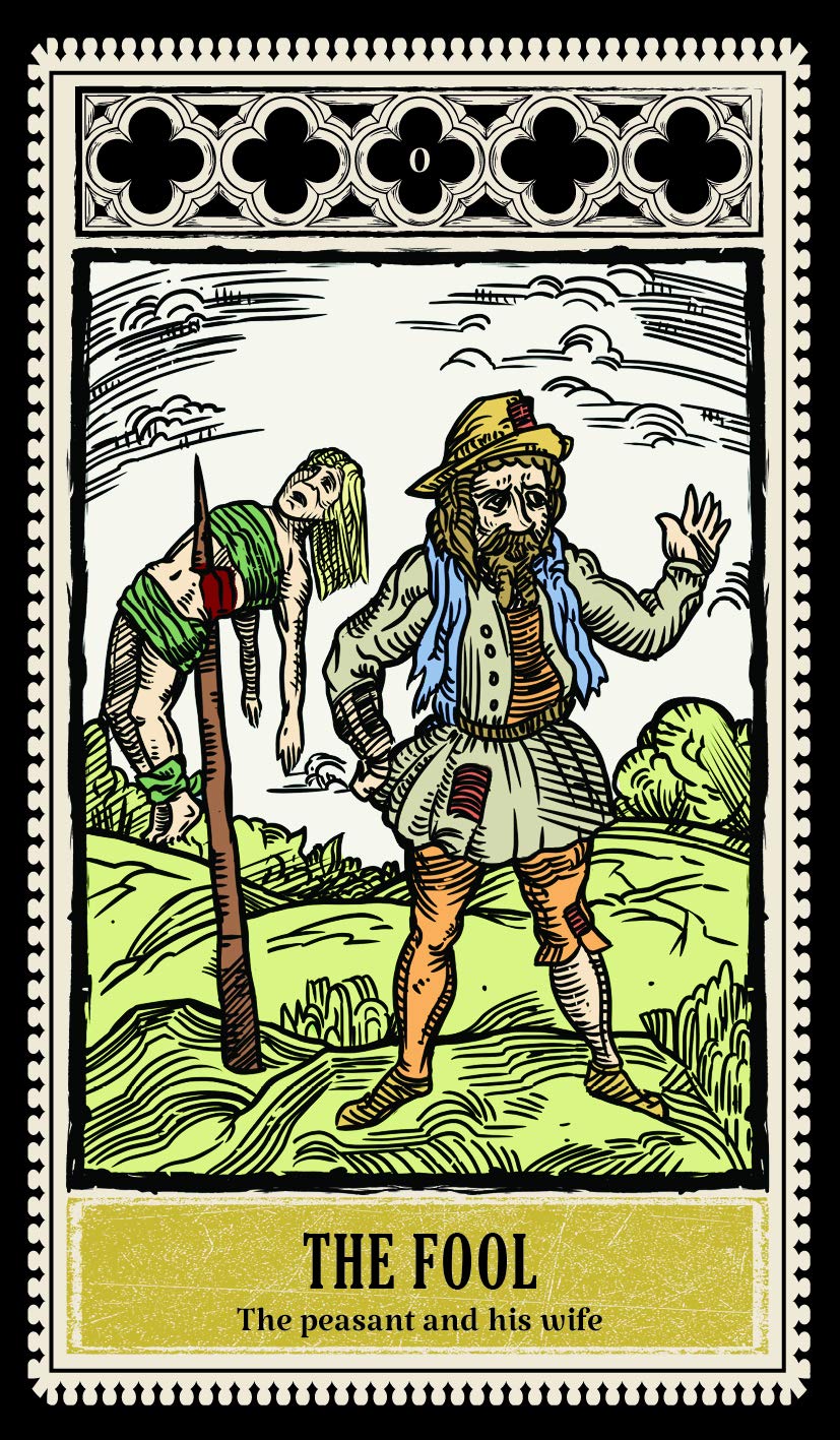 The 78 original woodcuts of the deck depict scenes of cruelty and cunning masterfully drawn by Russian artist Nikita Vuimin from instructions provided by Travis McHenry, author of the Occult Tarot and Angel Tarot and one of the foremost occultists of the modern era.