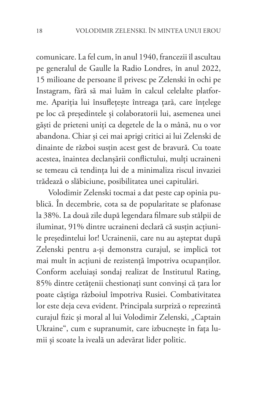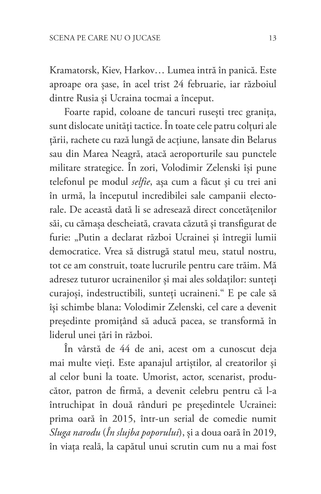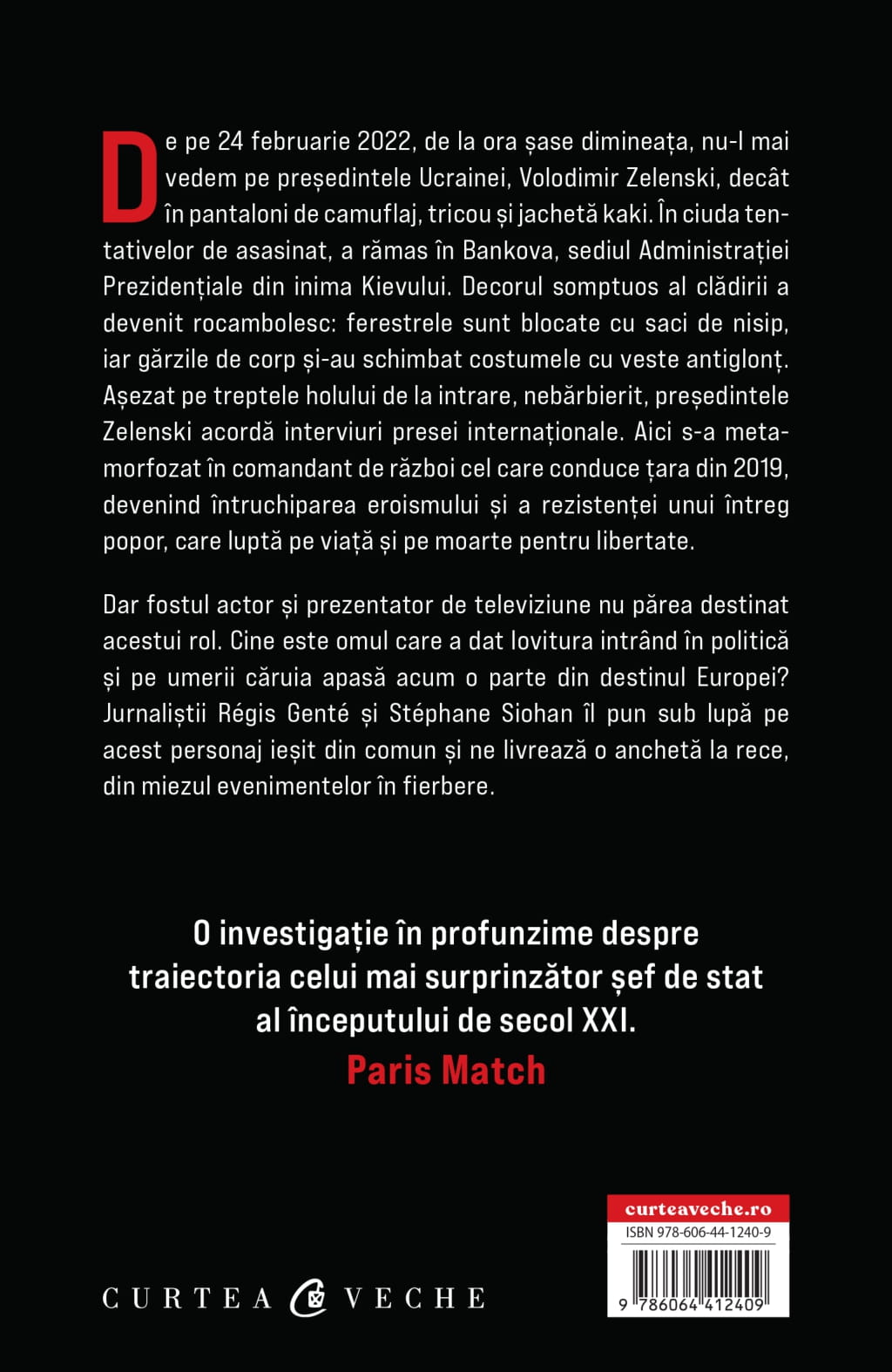 De pe 24 februarie 2022, de la ora șase dimineața, nu-l mai vedem pe președintele Ucrainei, Volodimir Zelenski, decât în pantaloni de camuflaj, tricou și jachetă kaki. În ciuda tentativelor de asasinat, a rămas în Bankova, sediul AdministrațieiPrezidențiale din inima Kievului. Decorul somptuos al clădirii a devenit rocambolesc: ferestrele sunt blocate cu saci de nisip,iar gărzile de corp și au schimbat costumele cu veste antiglonț. Așezat pe treptele holului de la intrare, nebărbierit, președinteleacordă interviuri presei internaționale. Aici s-a metamorfozat în comandant de război cel care conduce țara din 2019,devenind întruchiparea eroismului și a rezistenței unui întreg popor, care luptă pe viață și pe moarte pentru libertate. Dar fostul actor și prezentator de televiziune nu părea sortit acestui rol. Această carte este despre un destin imprevizibil și excepțional.