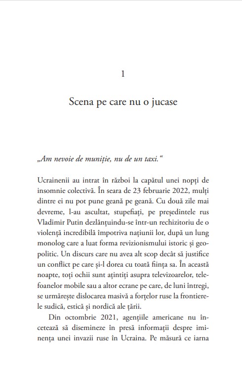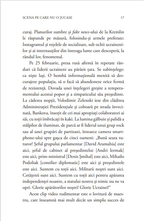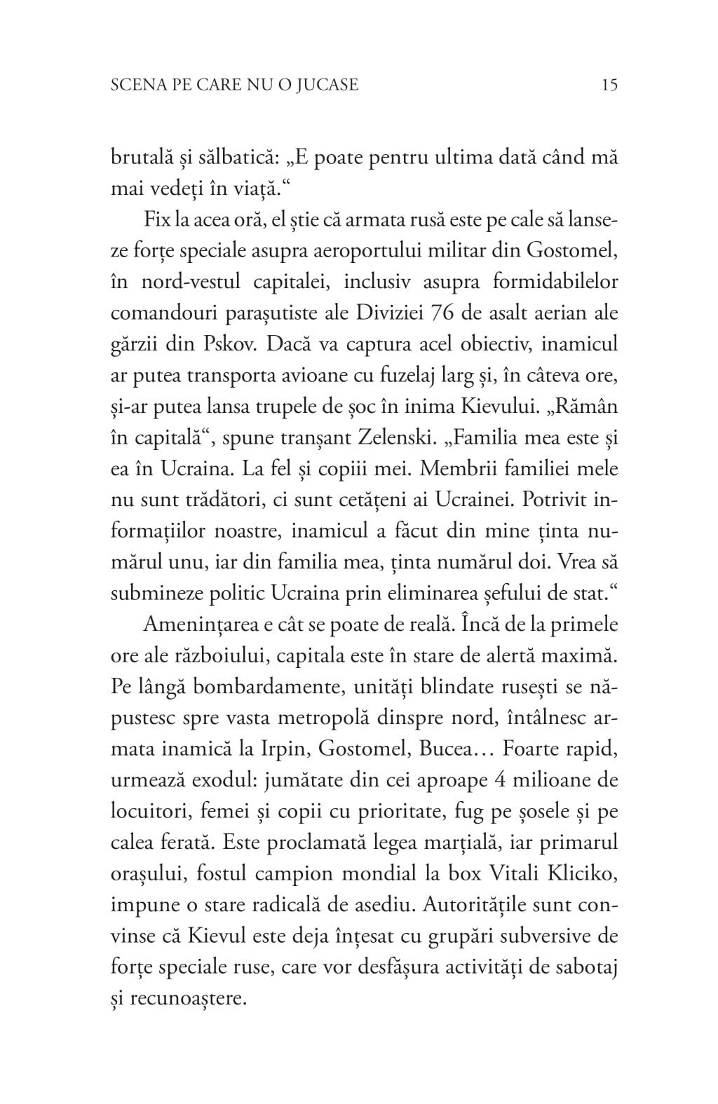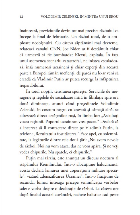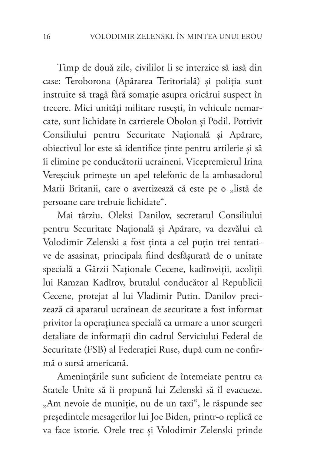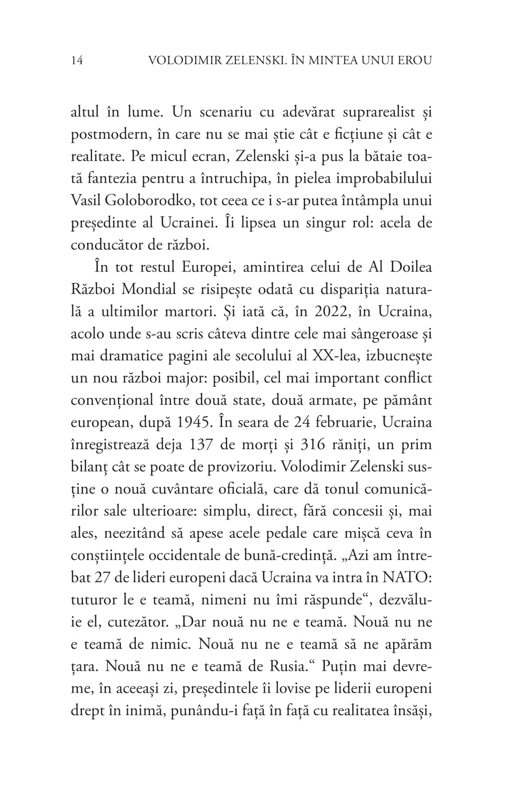 De pe 24 februarie 2022, de la ora șase dimineața, nu-l mai vedem pe președintele Ucrainei, Volodimir Zelenski, decât în pantaloni de camuflaj, tricou și jachetă kaki. În ciuda tentativelor de asasinat, a rămas în Bankova, sediul AdministrațieiPrezidențiale din inima Kievului. Decorul somptuos al clădirii a devenit rocambolesc: ferestrele sunt blocate cu saci de nisip,iar gărzile de corp și au schimbat costumele cu veste antiglonț. Așezat pe treptele holului de la intrare, nebărbierit, președinteleacordă interviuri presei internaționale. Aici s-a metamorfozat în comandant de război cel care conduce țara din 2019,devenind întruchiparea eroismului și a rezistenței unui întreg popor, care luptă pe viață și pe moarte pentru libertate. Dar fostul actor și prezentator de televiziune nu părea sortit acestui rol. Această carte este despre un destin imprevizibil și excepțional.