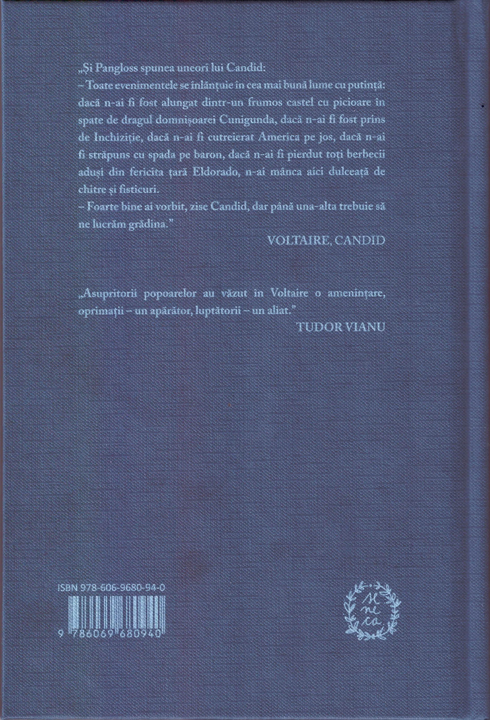 Pentru a introduce cititorul în opera și viața lui Voltaire, dar și în contextul social și politic al veacului al XVIII-lea, am ales, ca text de deschidere, eseul biografic al lui Tudor Vianu despre Voltaire, apărut inițial la Editura Tineretului, în 1955, iar în 1972, la Editura Albatros. În ediția de față, am preluat textul apărut în 1972.