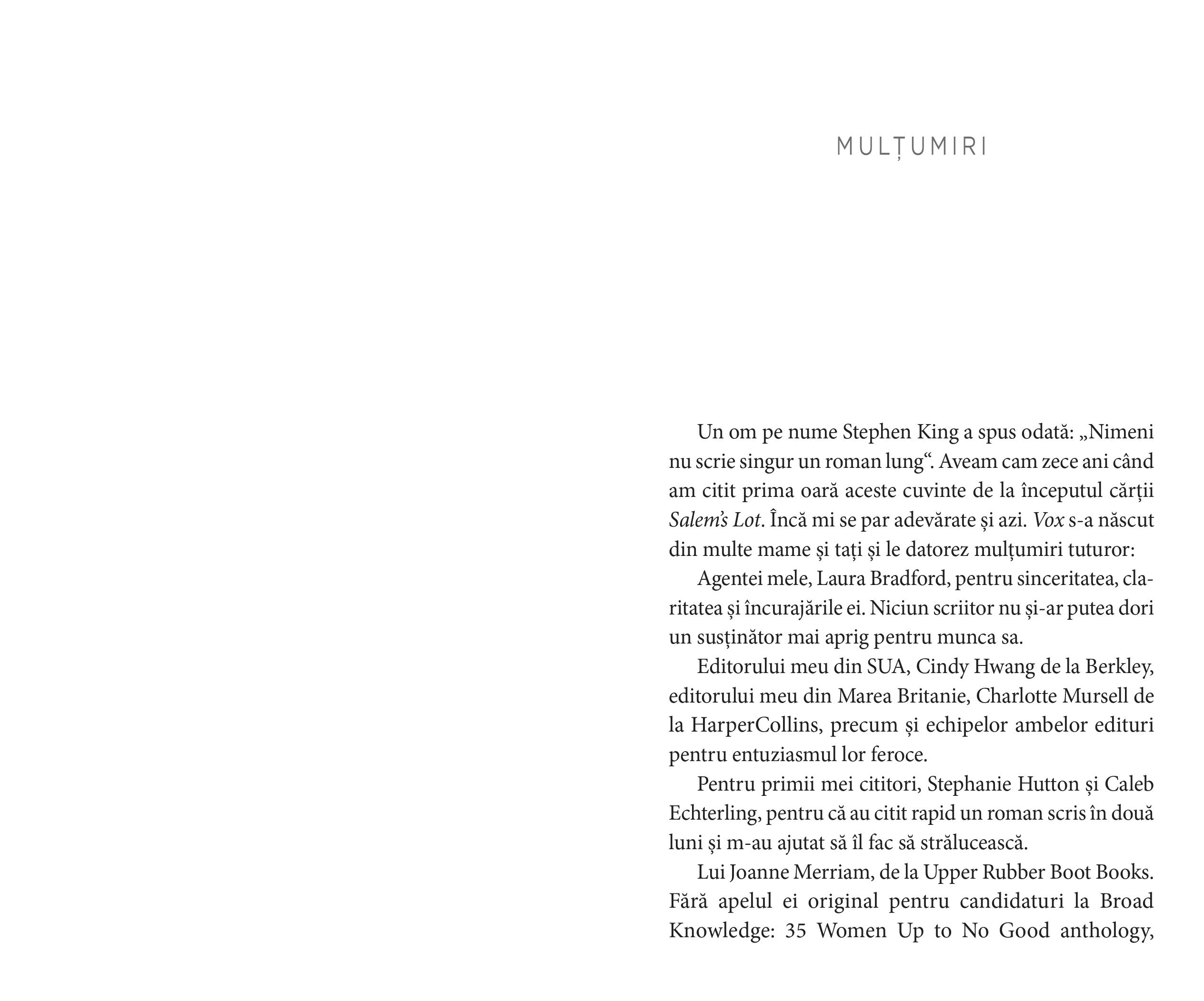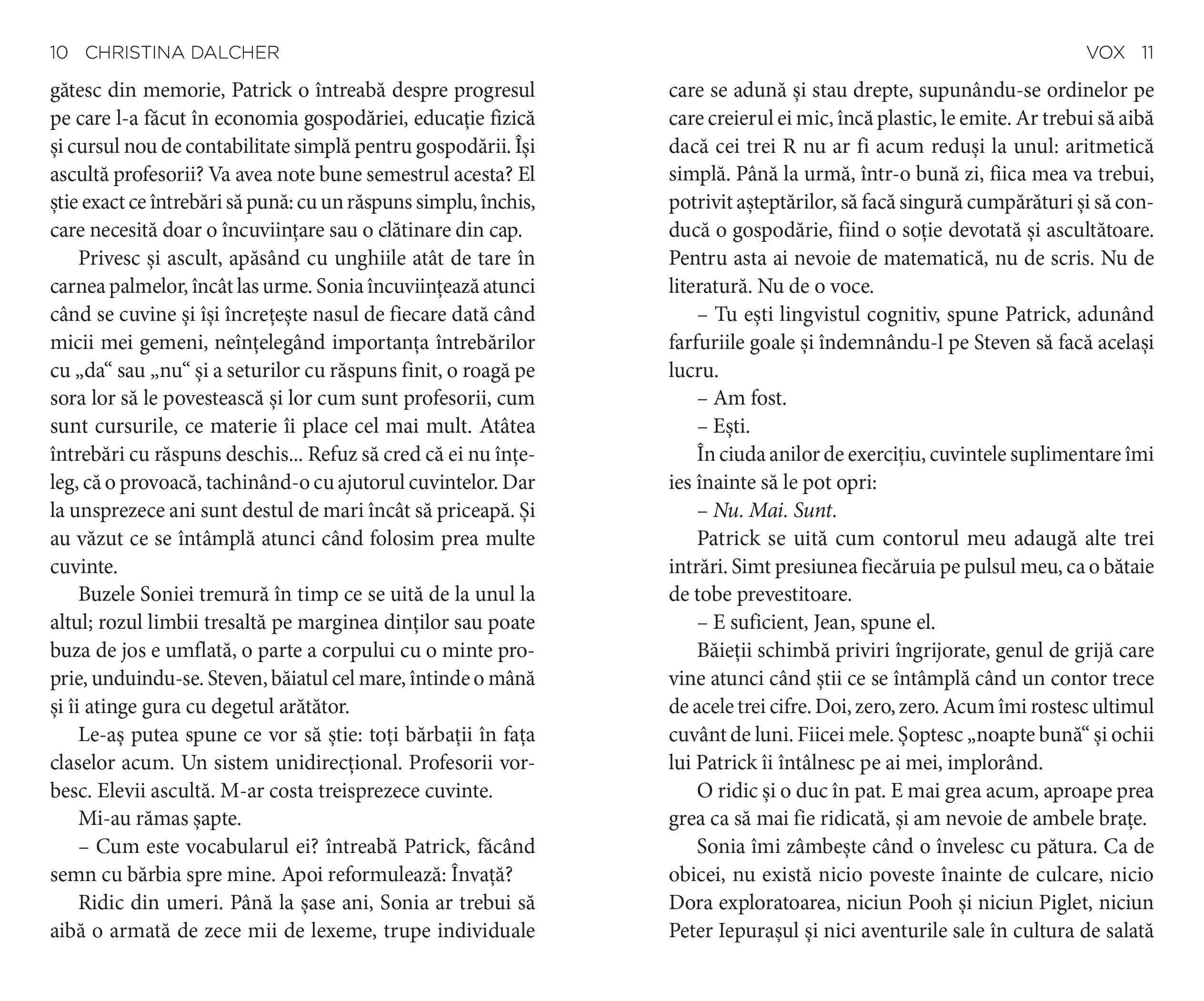 Însă acum își duce zilele într-o tăcere impusă, limitându- se la un număr prestabilit de cuvinte zilnice. Mișcarea Pură, cu respectul ei față de rolurile tradiționale de gen bazat pe învățăturile Bibliei, a pus în mișcare acest regim draconic; bărbații aflați la putere au crescut miza jocului. Când fratele președintelui suferă un atac de cord, Jean este recrutată pentru a accelera căutarea leacului pentru afazie. Răsplata ei? O pauză de la rațiile zilnice de vorbit pentru ea și pentru fiica ei și asigurări că legile privind tăcerea forțată vor fi curând abolite. Dar, după cum va descoperi curând, doctorița McClellan este doar un pion într-un joc mult mai mare, unul care nu caută să vindece afazia, ci să o inducă. Publicul vizat? Toate femeile.