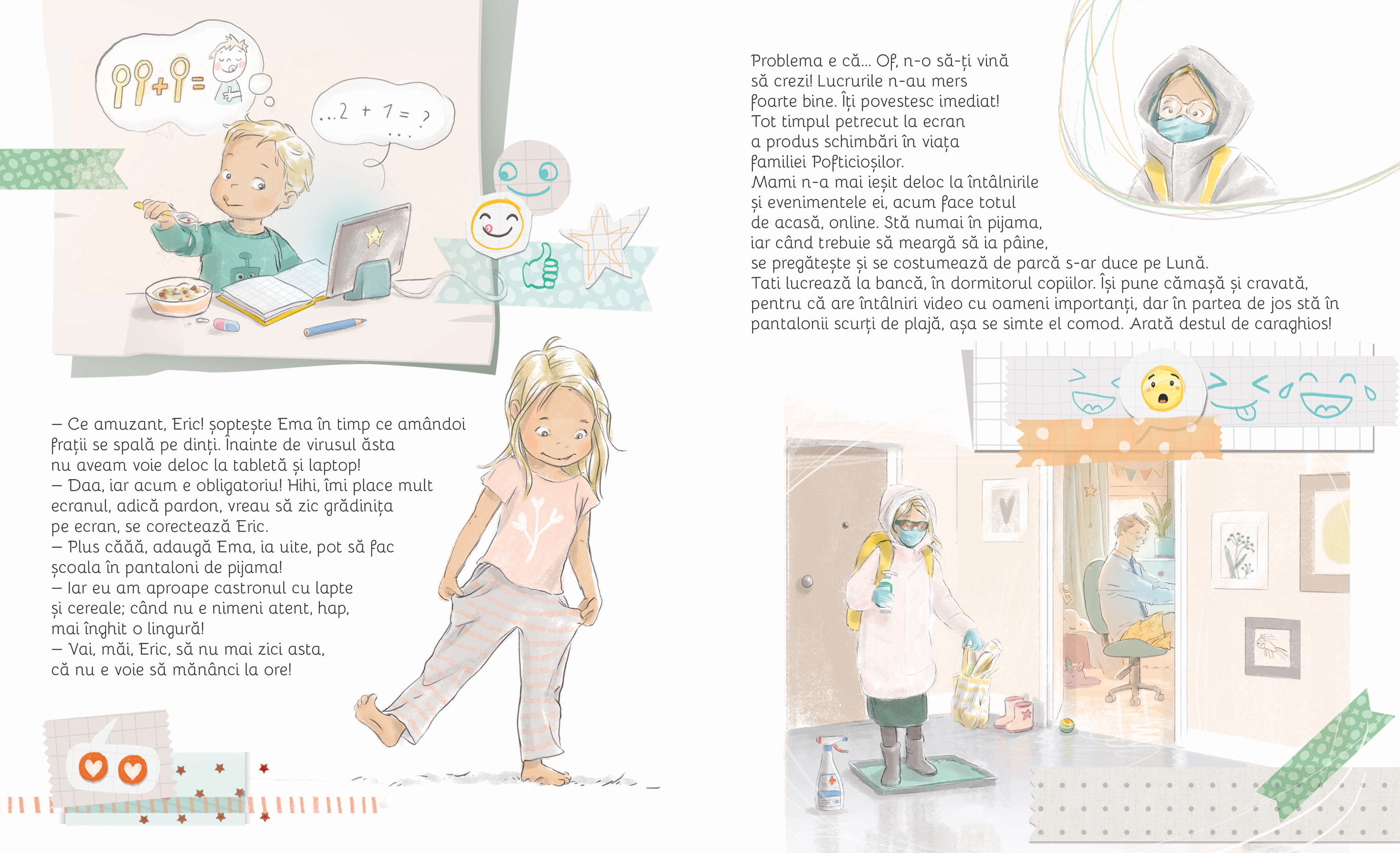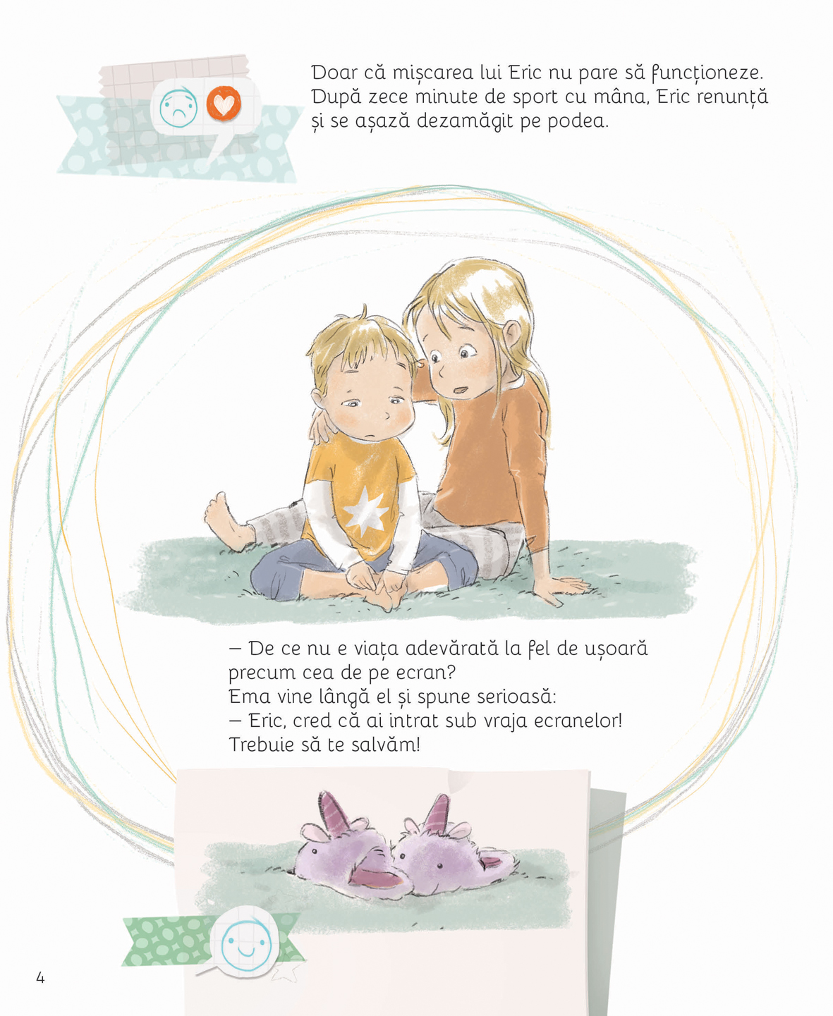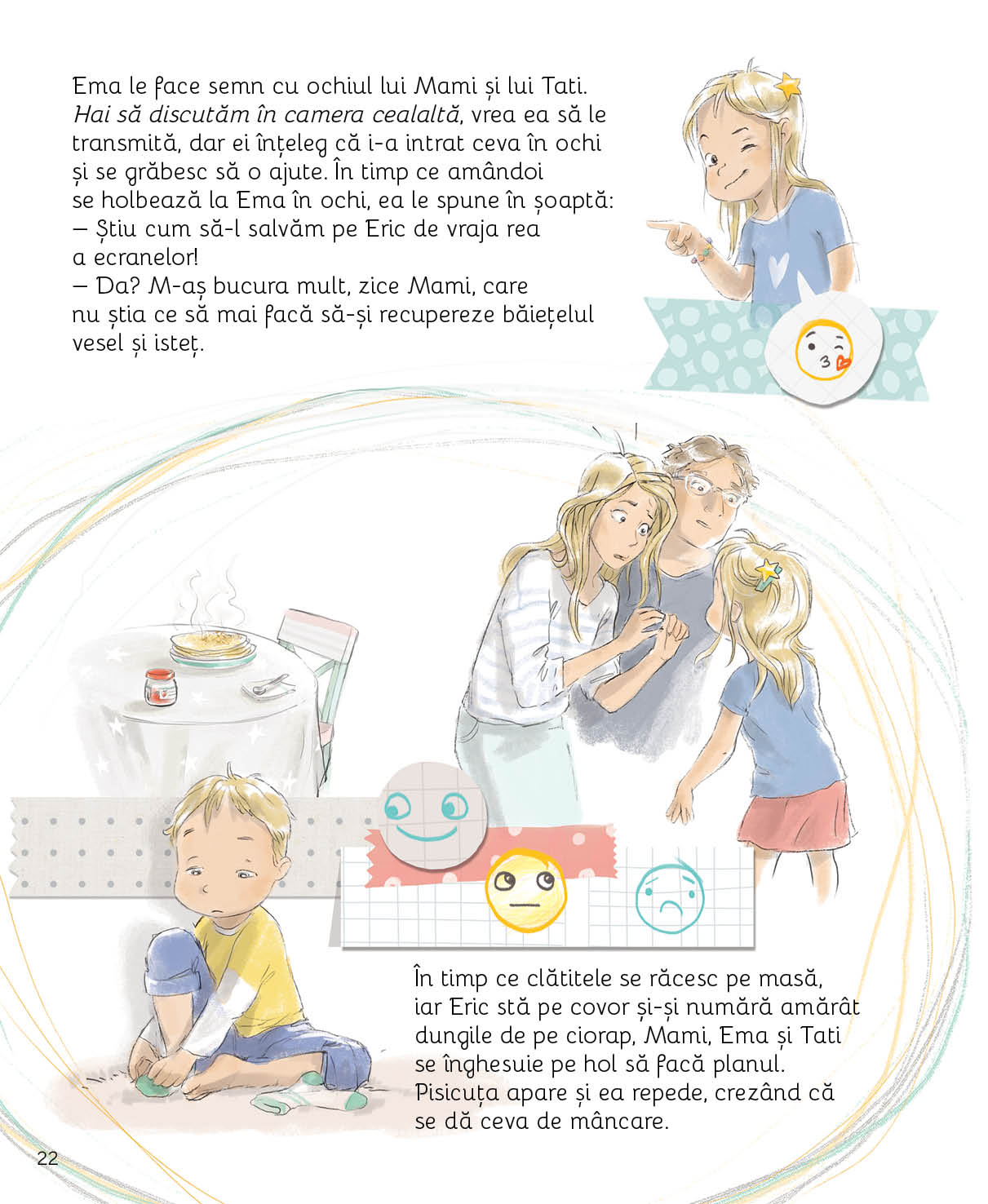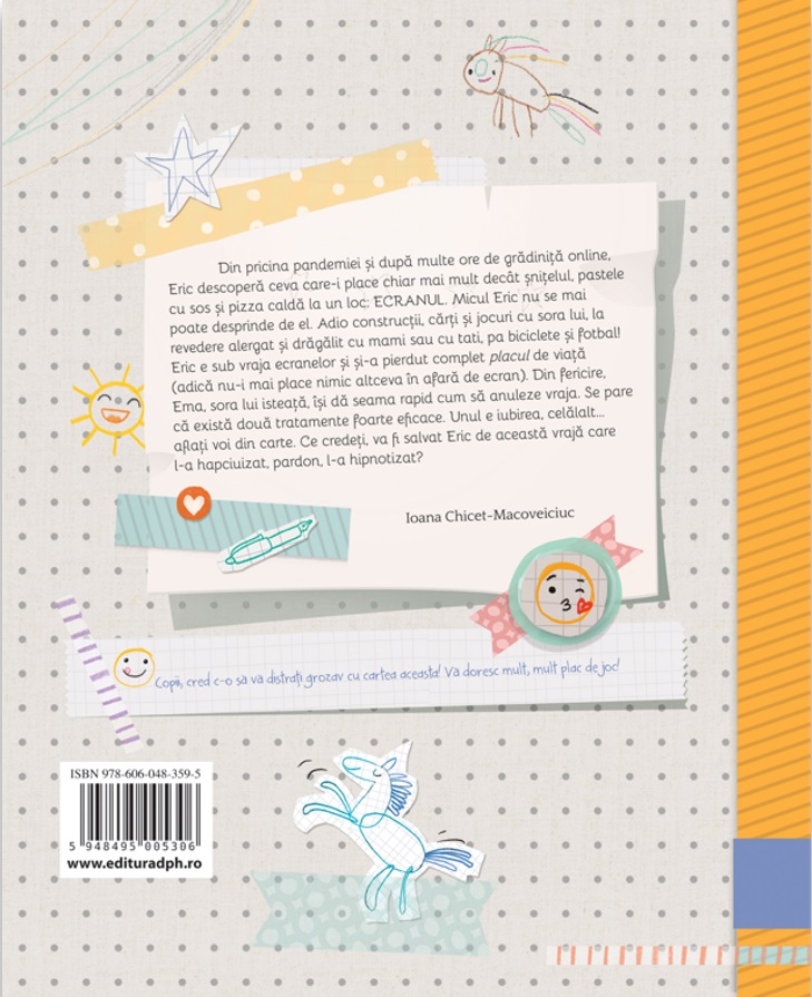 Din pricina pandemei și după multe ore de grădiniță online, Eric descoperă ceva care-i place chiar mai mult decât șnițelul, pastele cu sos și pizza caldă la un loc: ECRANUL. Micul Eric nu se mai poate desprinde de el. Adio cărți și jocuri cu sora lui, la revedere alergat și drăgălit cu mami sau cu tati, pa biciclete și fotbal! Eric e sub vraja ecranelor și și-a pierdut complet placul de viață (adică nu-i mai place nimic altceva în afară de ecran). Din fericire, Ema, sora lui isteață, își dă seama rapid cum să anuleze vraja. Se pare că există două tratamente foarte eficace. Vă lasăm să le descoperiți din carte.