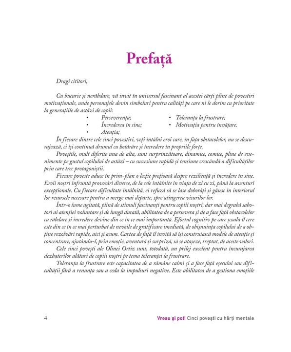 Cu bucurie și nerăbdare, vă invit în universul fascinant al acestei cărți pline de povestiri motivaționale, unde personajele devin simboluri pentru calități pe care ni le dorim cu prioritate la generațiile de astăzi de copii: