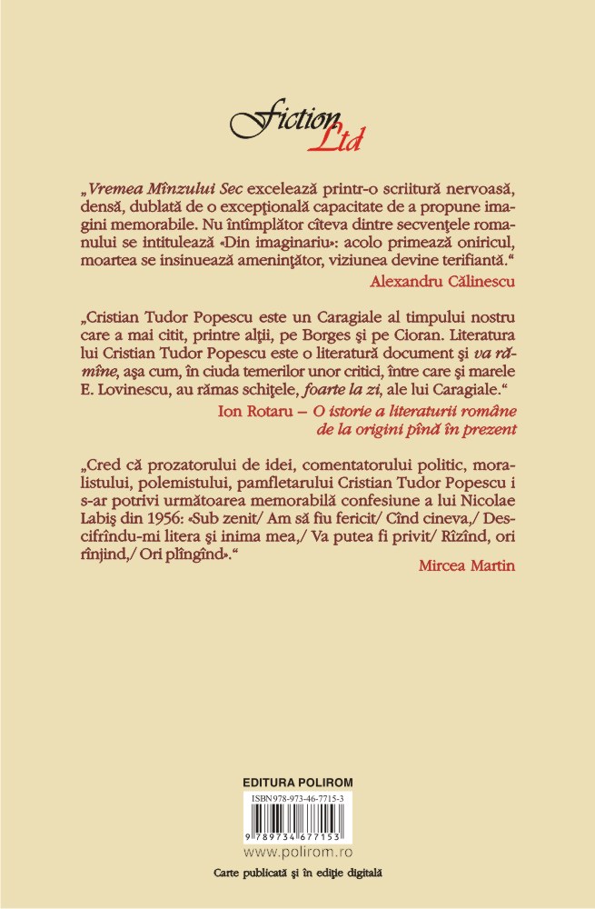 „Cristian Tudor Popescu are «punci», narațiunea sa trezește îndată interes prin nerv și forță percutantă. Rămîne mereu un bun observator, care știe să surprindă natura aparte din oameni și mai ales amprenta pe care o pune asupra lor timpul. Pînă la un punct, Vremea Mînzului Sec este o resuscitare originală a romanului picaresc, cu o ironie secretă întoarsă către un timp al degradării.” (Ovid S. Crohmălniceanu)