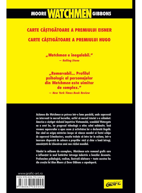 Vândut în milioane de exemplare, Watchmen este romanul grafic care a influențat în mod hotărâtor întreaga industrie a benzilor desenate. Profunzime psihologică, realism, ilustrații uluitoare - toate acestea fac din creația lui Allan Moore și Dave Gibbons o capodoperă.