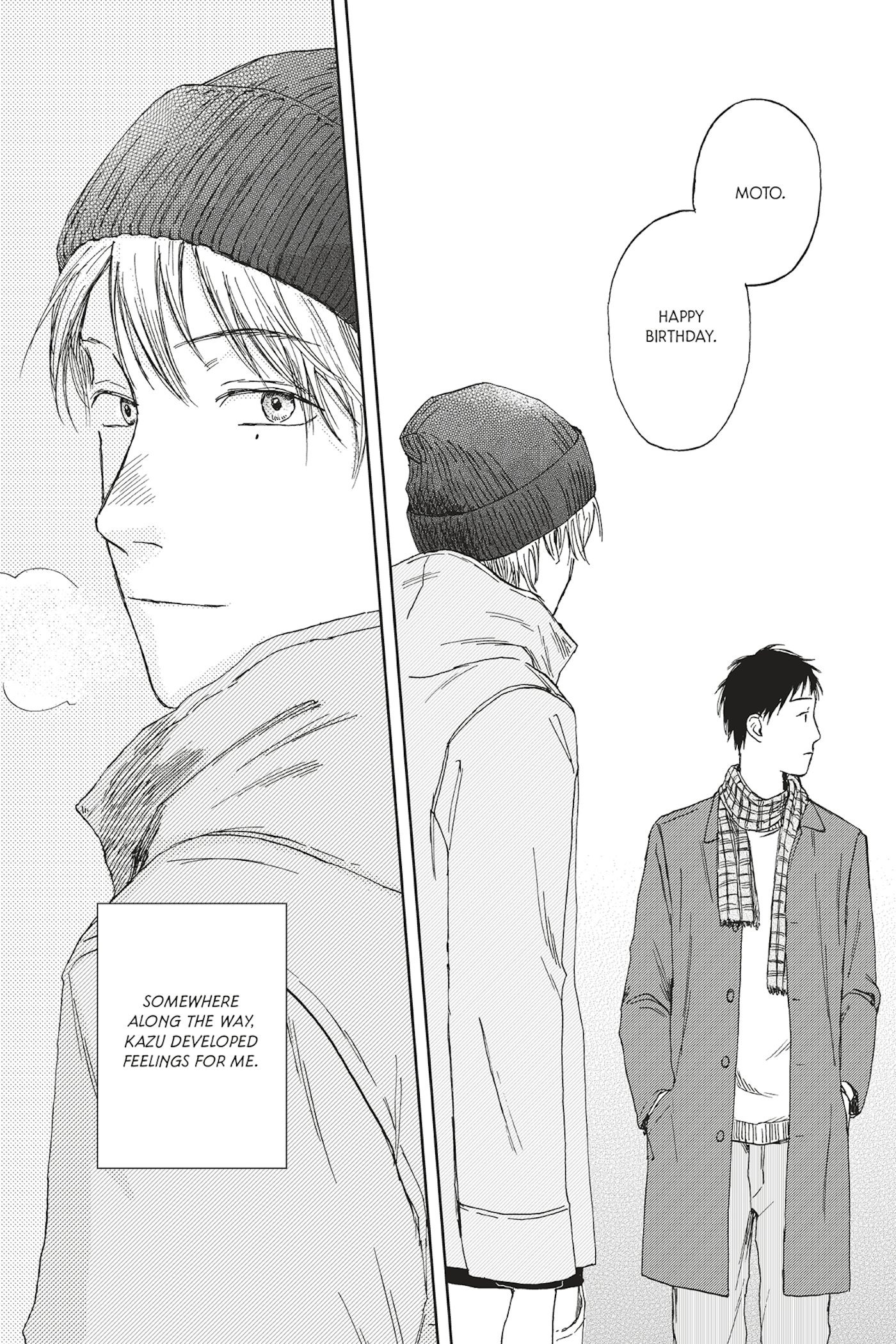 Outgoing and popular Kazu and shy and serious Moto grew up together as childhood best friends. But something changes during junior high, and the familiar, easy rhythm of their friendship begins to break apart as Kazu starts nursing deeper feelings for his oblivious friend.