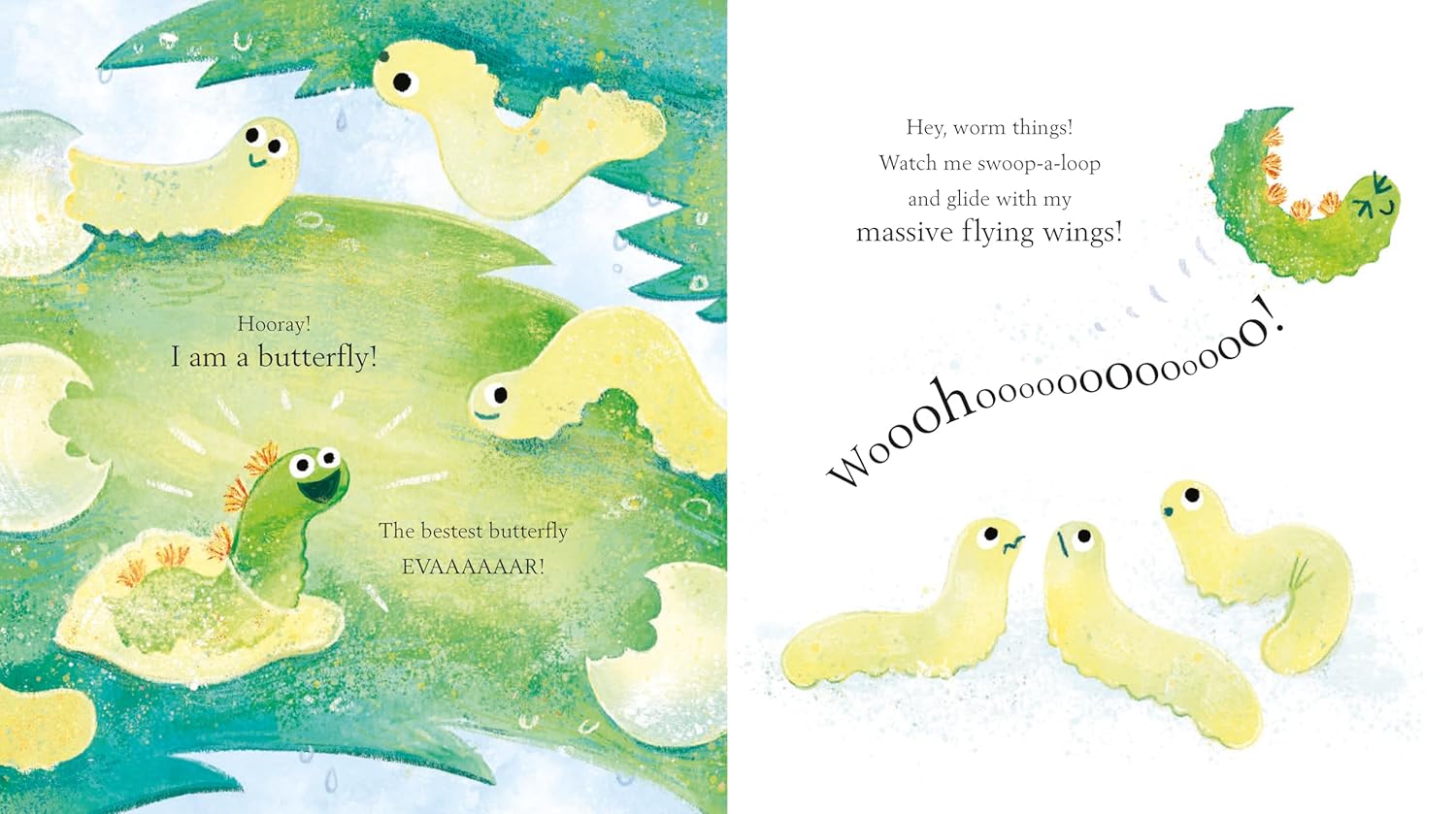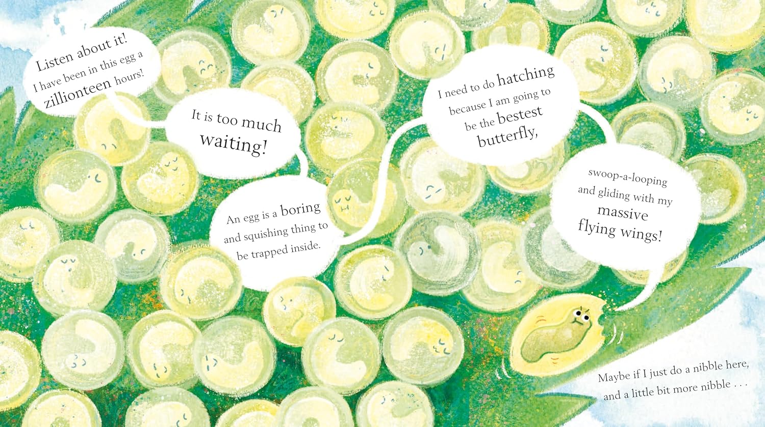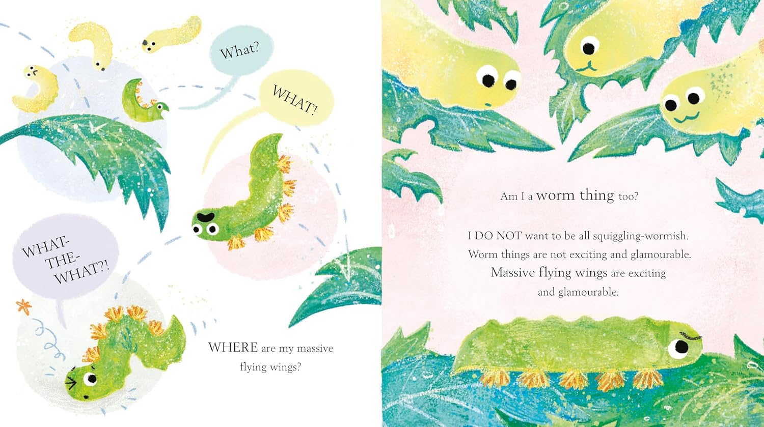 This little caterpillar can't wait to become a butterfly, swoop-a-looping with massive flying wings. But there is TOO MUCH WAITING. First you have to eat LOTS of leaves. Then you have to make a cocoon . . . and wait some MORE before you can grow wings and fly!