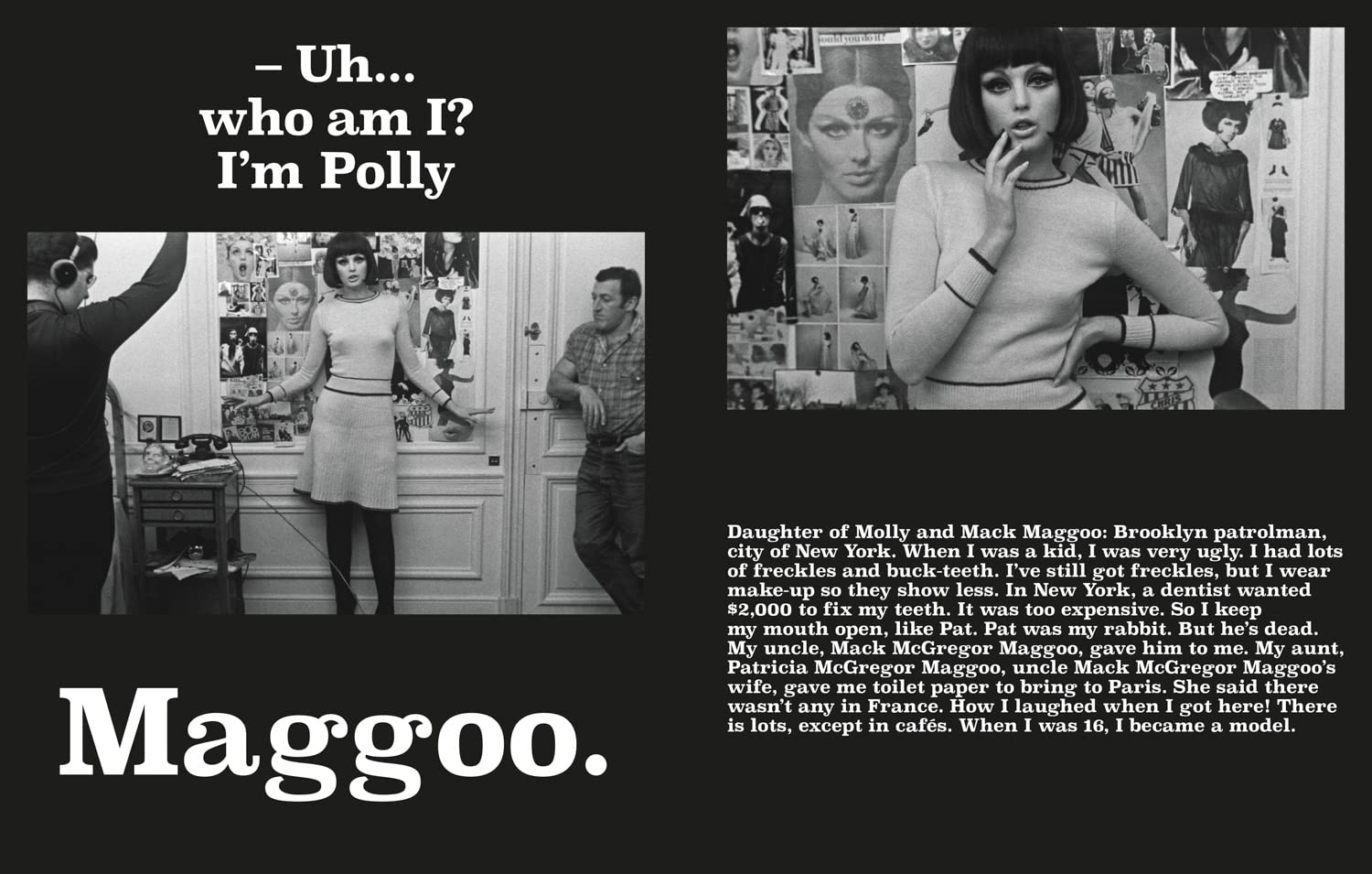 Based on the original images and dialogue of William Klein’s 1966 film Who Are You, Polly Maggoo?, this fantastic photo-novel tells the adventures of Polly Maggoo, a star model played by Dorothy McGowan (model for Vogue in the 1960s). The plot unfolds across the fashion world of Polly Maggoo; the world of television (based around the character of director Jean Rochefort); and a magical kingdom of operetta whose crown prince (played by Sami Frey) is in love with the young model. Also featuring in this star-studded cast are Alice Sapritch, Delphine Seyrig, Philippe Noiret, Roland Topor and Jacques Seiler.