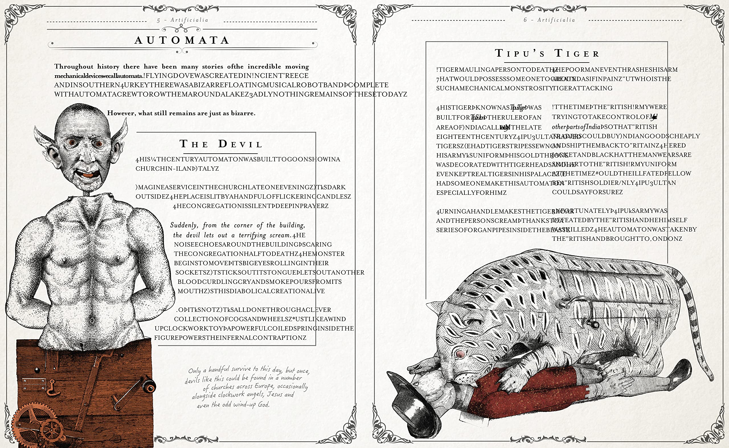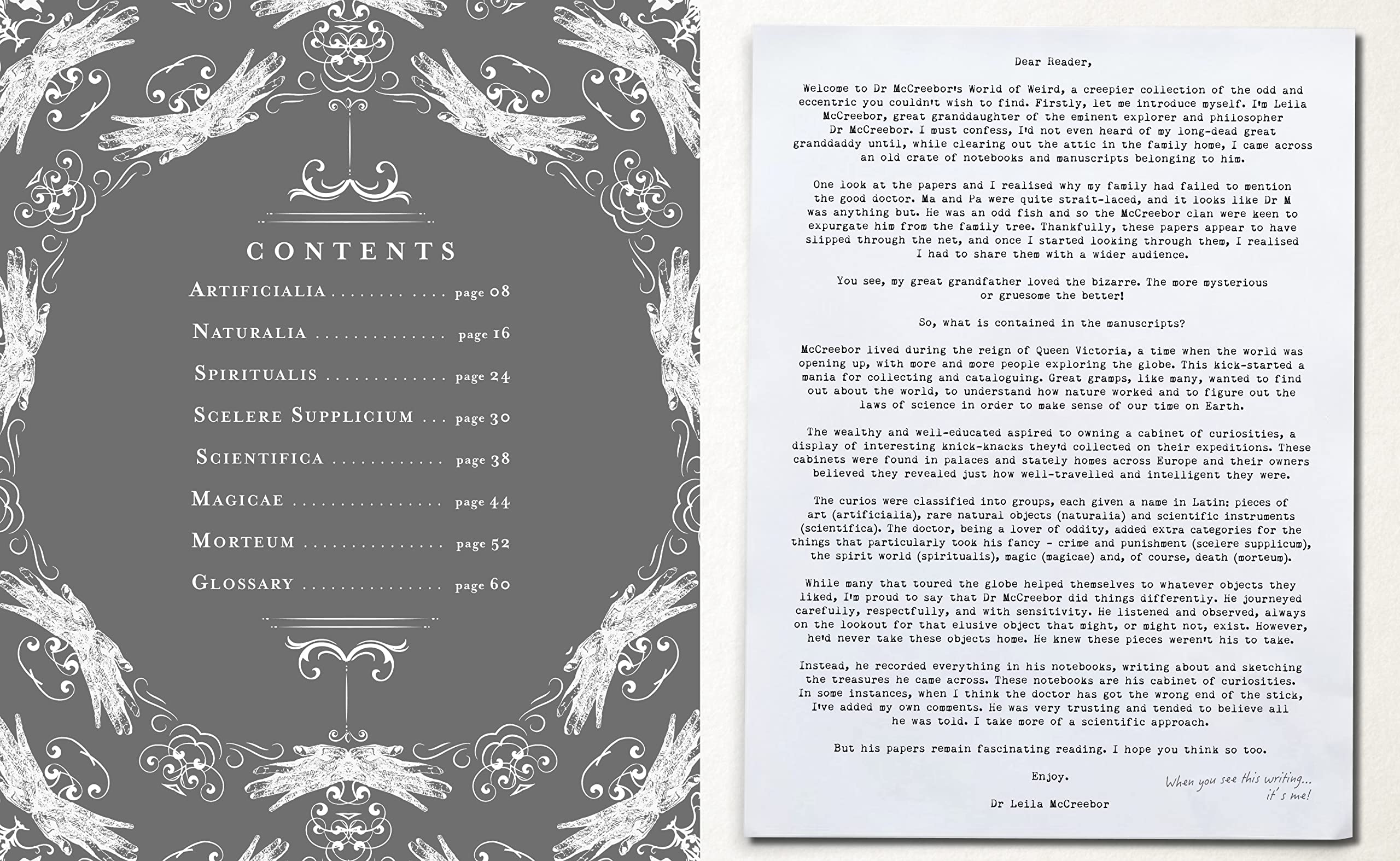Uncover Artificalia (man-made objects), Naturalia (natural creatures and beings), Spiritualis (the spirit world), ScelereSupplicium (crime and punishment), Scientifica (scientific tools), Magicae (magical objects) and Morteum (skulls, bodies and more). Steampunk illustrator Celsius Pictor intricately illustrates McCreebor’s sketches, maps, records and photographs.