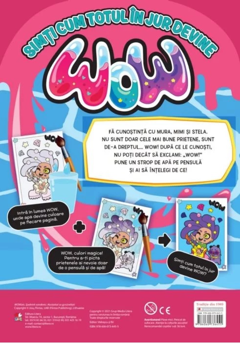 Nu sunt doar cele mai bune prietene, sunt de-a dreptul... wow! După ce le cunoști, nu poți decât să exclami: „wow!“ Pune un strop de apă pe pensulă și ai să înțelegi de ce! Intră în lumea WOW, unde apa devine culoare pe fiecare pagină. WOW, culori magice! Pentru a-ţi picta prietenele ai nevoie doar de o pensulă...