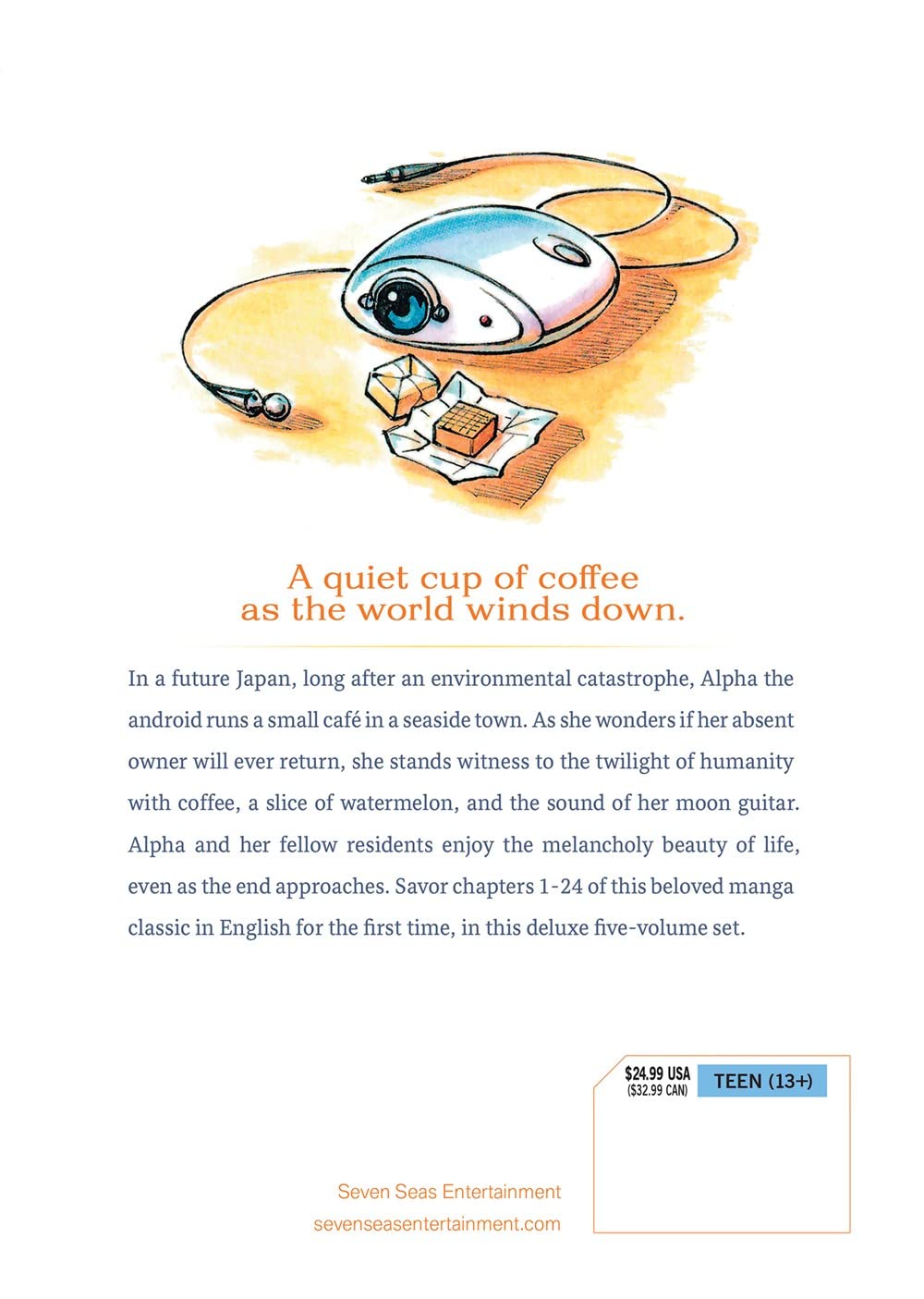 In a future Japan, long after an environmental catastrophe, Alpha the android runs a small café in a seaside town. As she wonders if her absent owner will ever return, she stands witness to the twilight of humanity with coffee, a slice of watermelon, and the sound of her moon guitar. Alpha and her fellow residents enjoy the melancholy beauty of life, even as the end approaches. Savor chapters 1-24 of this beloved manga classic in English for the first time, in this deluxe five-volume set.