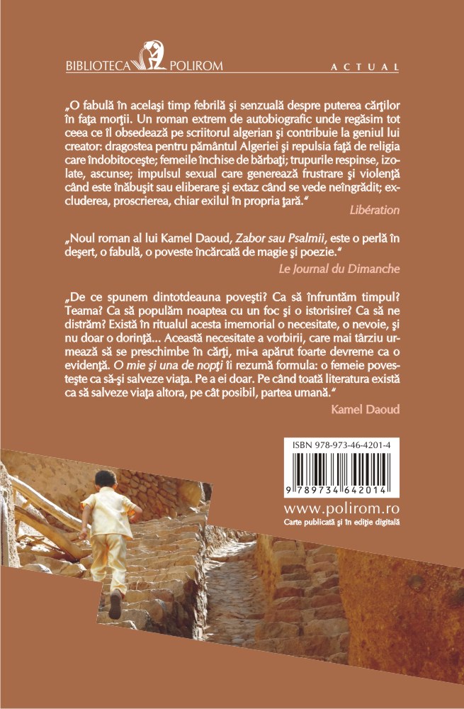 „De ce spunem dintotdeauna poveşti? Ca să înfruntăm timpul? Teama? Ca să populăm noaptea cu un foc şi o istorisire? Ca să ne distrăm? Există în ritualul acesta imemorial o necesitate, o nevoie, şi nu doar o dorinţă... Această necesitate a vorbirii, care mai tîrziu urmează să se preschimbe în cărţi, mi-a apărut foarte devreme ca o evidenţă. O mie şi una de nopţi îi rezumă formula: o femeie povesteşte ca să-şi salveze viaţa. Pe a ei doar. Pe cînd toată literatura există ca să salveze viaţa altora, pe cît posibil, partea umană.” (Kamel Daoud)