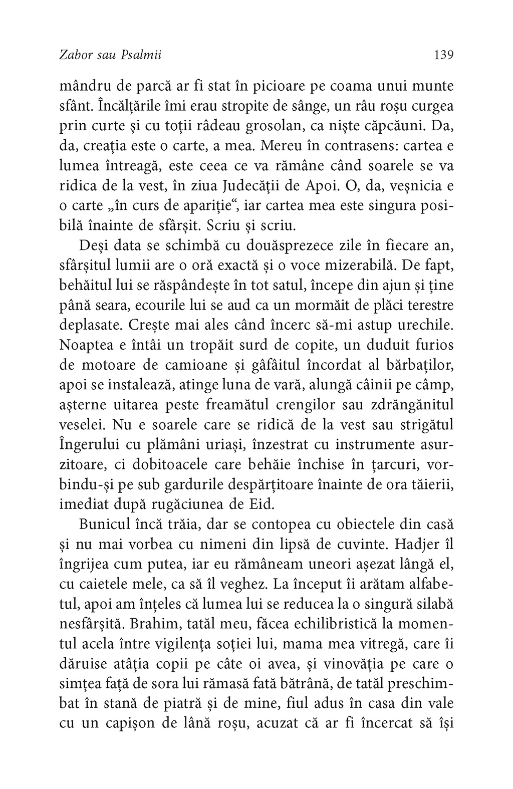 Alungat de-acasă de tatăl care îşi întemeiază o nouă familie, Zabor creşte într-o magherniţă de la marginea satului, alături de o mătuşă fată bătrînă cu o pasiune nesănătoasă pentru filmele de dragoste indiene şi de un bunic suspendat într-o veşnică agonie. Singurele sale bucurii sînt cărţile, citite sau pur şi simplu închipuite, care îi alină singurătatea şi îl ajută să-şi descopere menirea. Fiindcă, în ciuda diformităţii sale şi a glasului enervant, ca un behăit de berbec dus la tăiere, Zabor este înzestrat cu un talent miraculos: poate să ţină moartea la distanţă scriind. Poveşti alambicate, înţesate de amănunte, în care poţi recunoaşte pentru o clipă scene sau personaje desprinse din cărţi celebre ale literaturii universale şi care îl transformă pe Zabor într-o stranie Şeherezadă scripturală. Romanul Zabor sau Psalmii (2017) a fost distins la un an după apariţie cu Premiul Méditerranée.