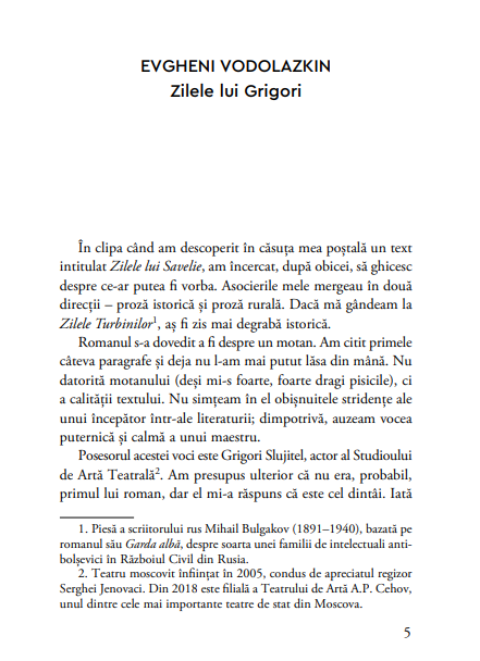 Prefațat cu entuziasm de Evgheni Vodolazkin și încununat în Rusia cu două mari premii, Zilele lui Savelie este un roman al pierderii și despărțirii, dar și al iubirii și frumuseții etern supraviețuitoare. El convinge prin limbajul rafinat și fluid, prin flexibilitatea și lejeritatea cu care autorul își manevrează structura narativă și prin complexitatea sa tematică și de gen: e în același timp pseudobiografie scrisă cu un zâmbet în colțul gurii, frescă a Moscovei de azi și de ieri și, nu în ultimul rând, metaforă a vieții omenești.