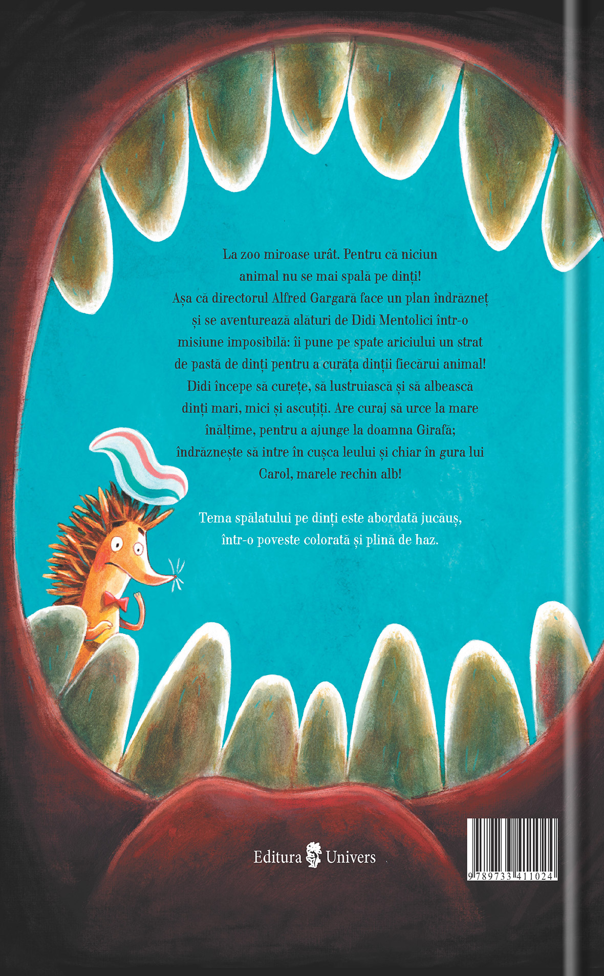 Tema spălatului pe dinţi este abordată jucăuş, într‑o poveste colorată şi plină de haz.