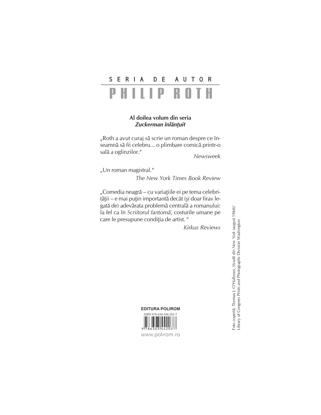 În al doilea volum al seriei „Zuckerman înlănţuit”, care-l aduce în scenă pe Nathan Zuckerman, alter ego ficţional al lui Philip Roth, tânărul romancier, care vrea să ducă o existenţă retrasă în ciuda celebrităţii nou dobândite în calitate de autor al unui bestseller, se aventurează pe străzile Manhattanului la finalul turbulenţilor ani 1960.