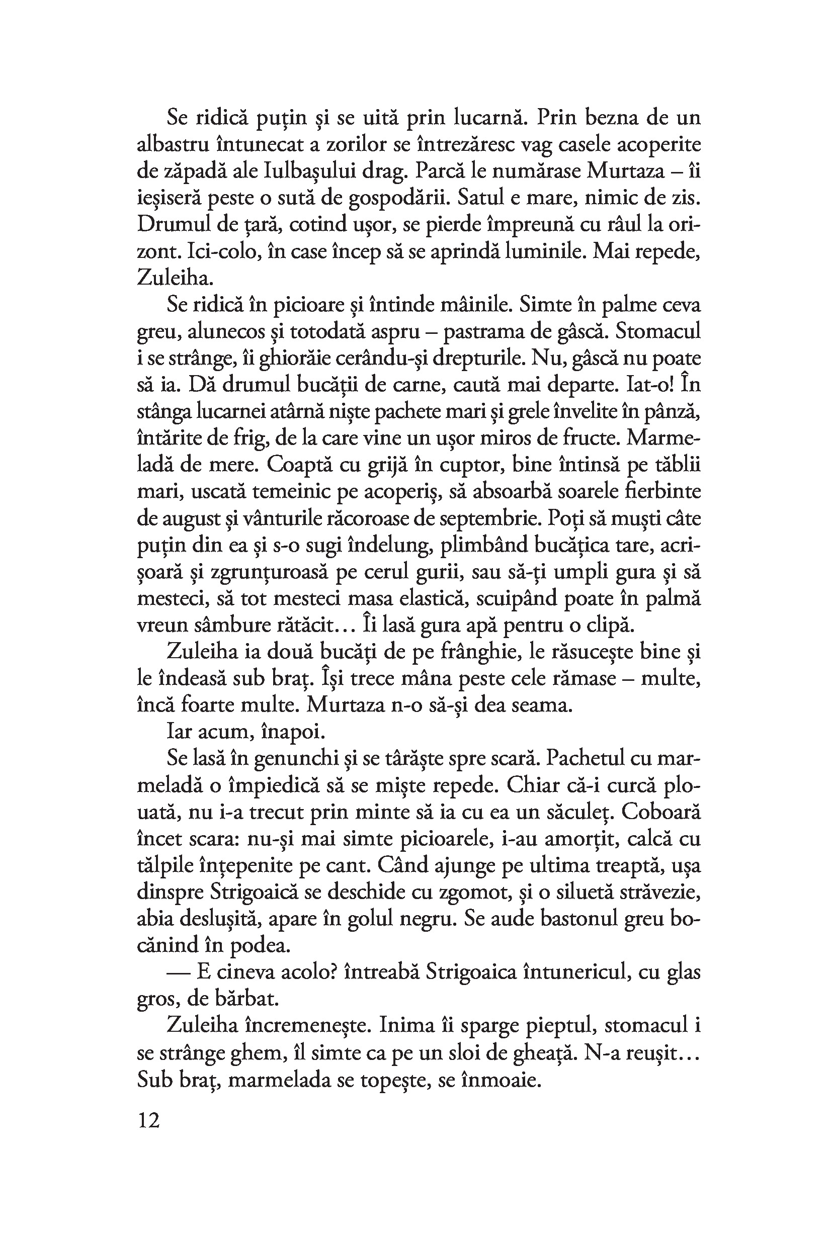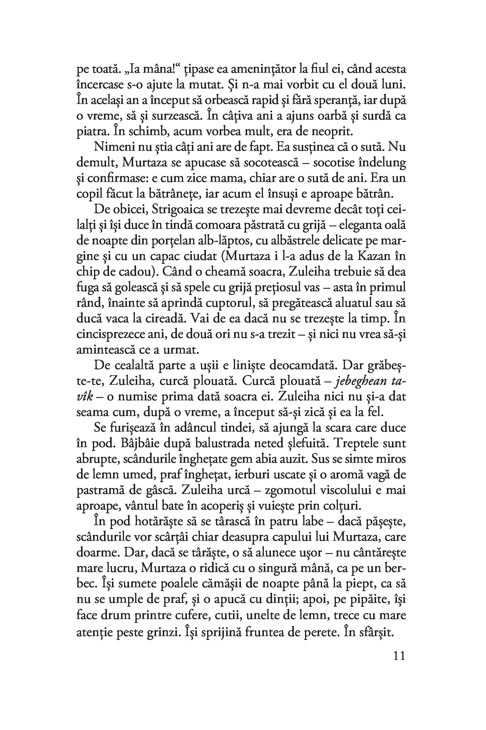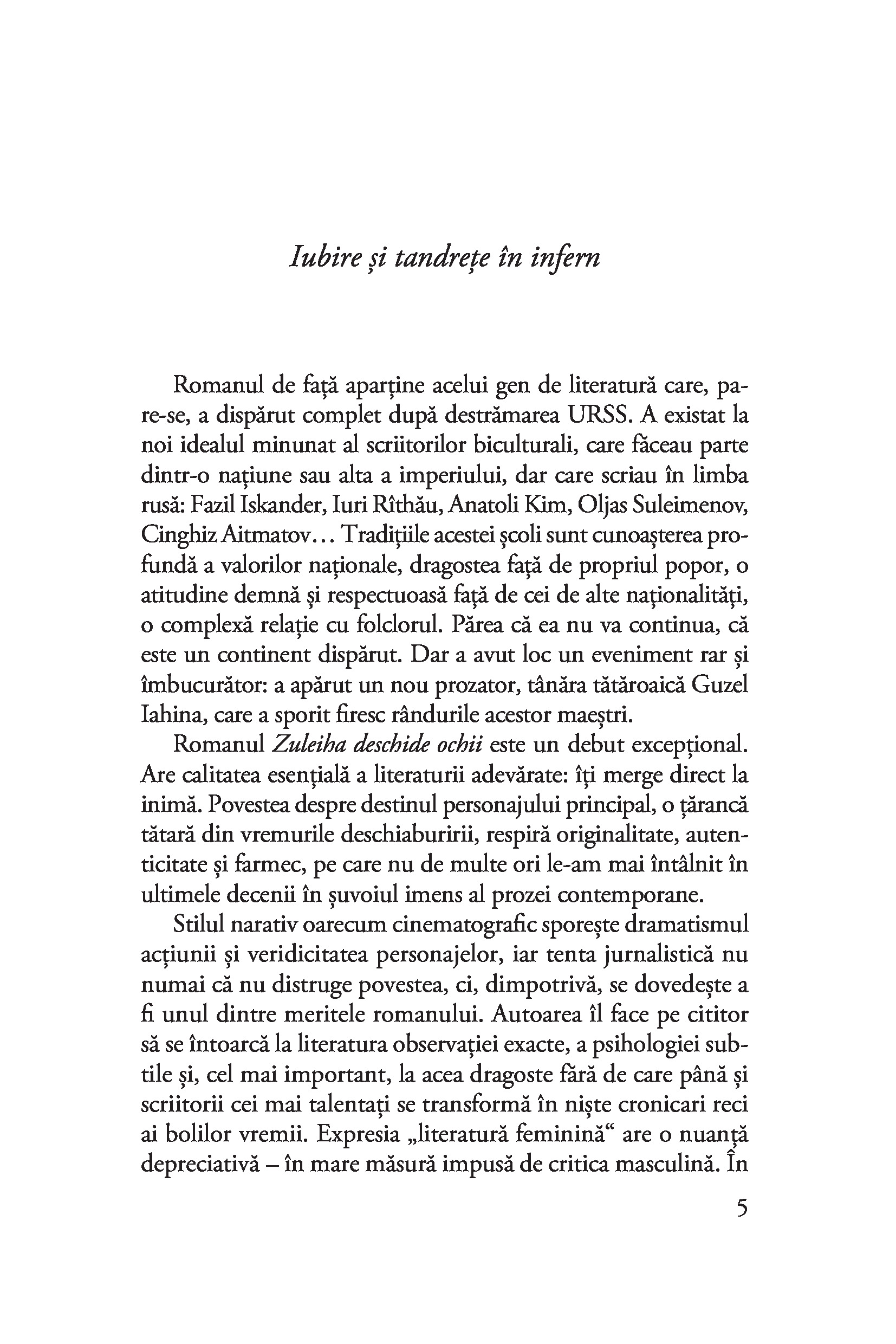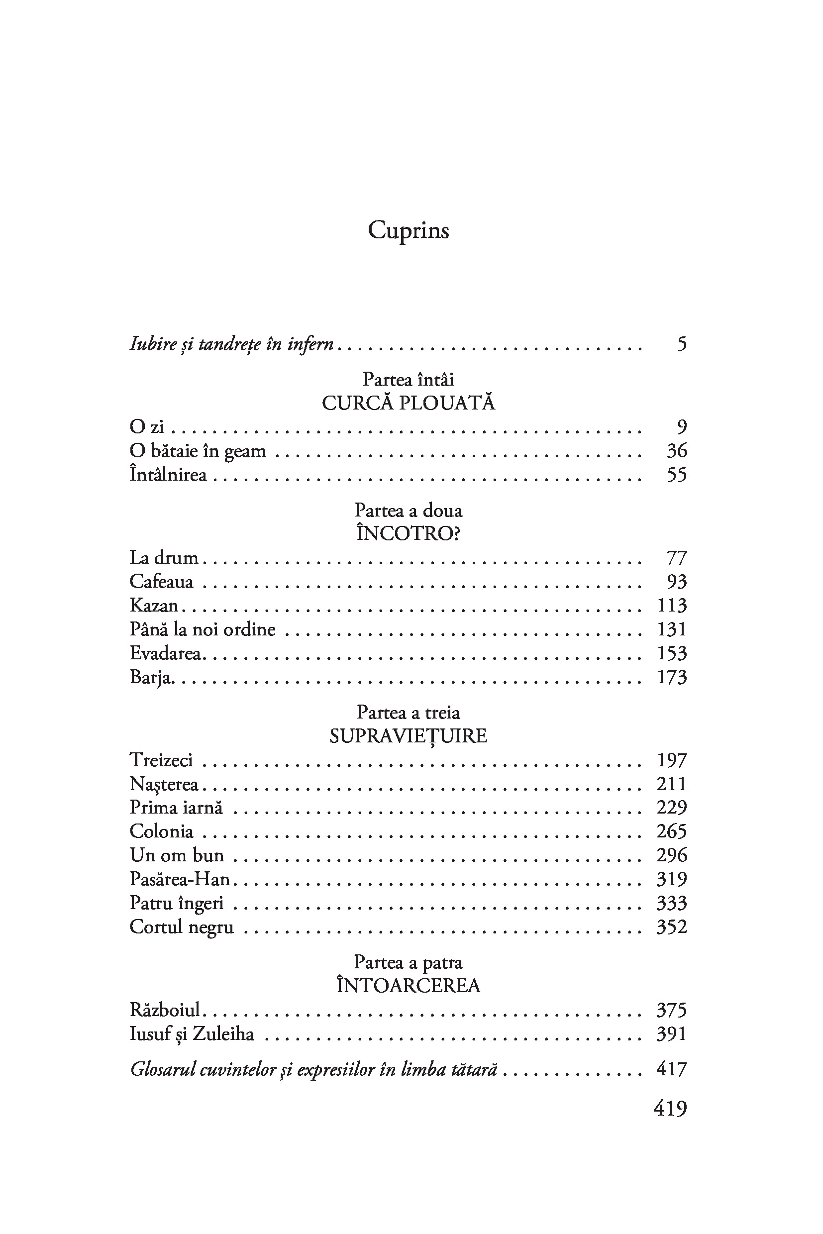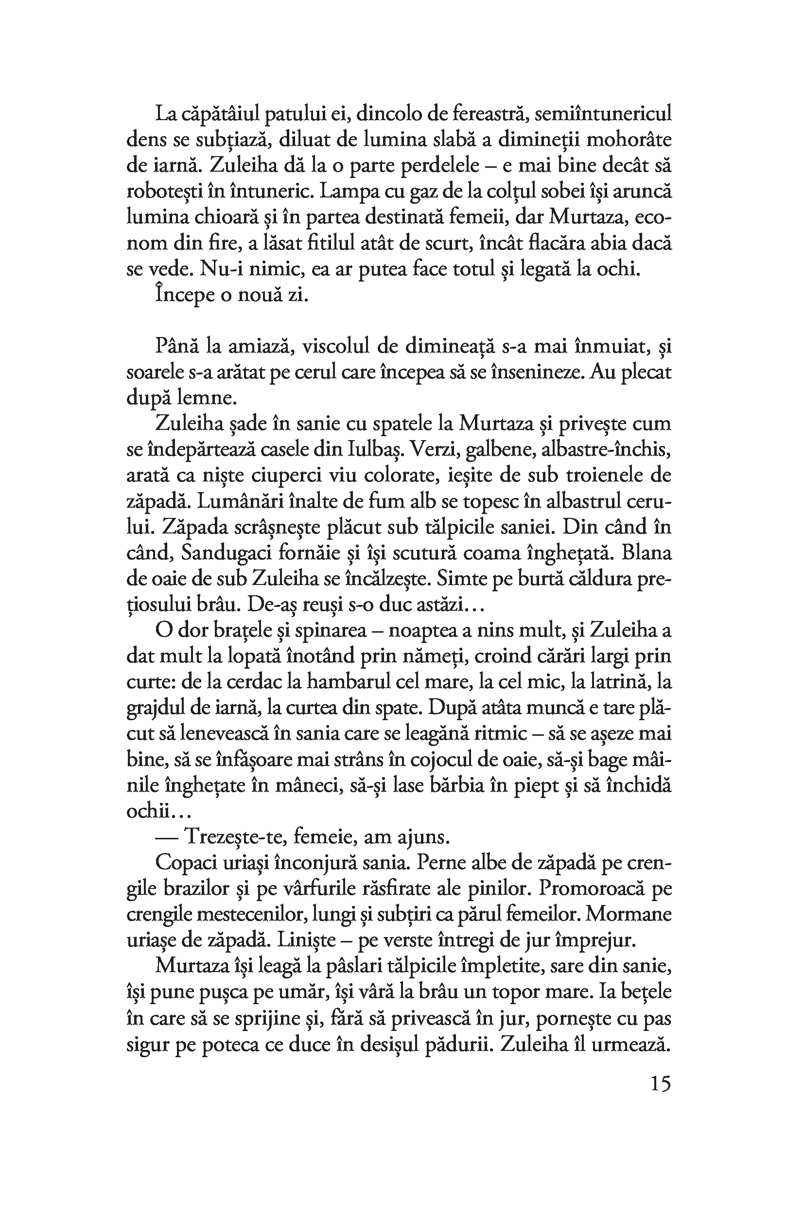 Zuleiha, o tânără gravidă dintr-un sat de tătari, e deportată în Siberia după uciderea soțului ei de către un ofițer din Armata Roșie. Face o călătorie lungă și chinuitoare, alături de țărani deschiaburiți și intelectuali leningrădeni, deținuți de drept comun, musulmani și creștini, credincioși și atei, ruși, tătari, nemți și ciuvași, ajungând într-un loc pustiu, cu o natură neîndurătoare. Iar comandantul coloniei de muncă înființate aici este chiar ucigașul soțului ei. Cu o tensiune crescândă, redată magistral de autoare, între Zuleiha și comandant se înfiripă o iubire stranie, reținută, dar de o intensitate covârșitoare. Personajele se transformă, rolurile se inversează, adevărurile devin incerte. Singura certitudine a eroinei rămâne dragostea față de fiul ei, Iusuf, pentru salvarea căruia este hotărâtă să plătească orice preț. Un roman impresionant prin amploare, suflu epic, forță de evocare și umanism.
