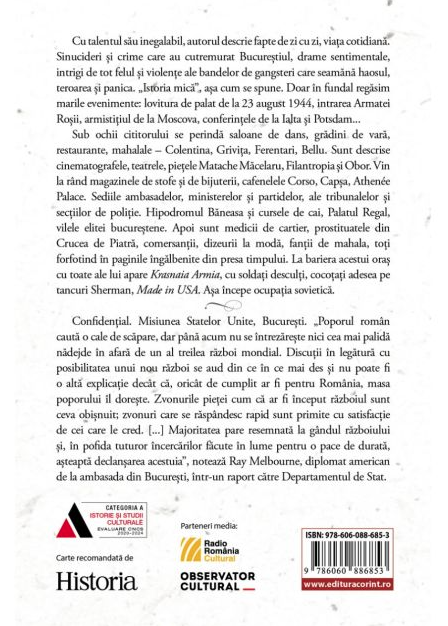 Apoi sunt medicii de cartier, prostituatele din Crucea de Piatră, comersanții, dizeurii la modă, fanții de mahala, toți forfotind în paginile îngălbenite din presa timpului. La bariera acestui oraș cu toate ale lui apare Krasnaia Armia, cu soldați desculți, cocoțați adesea pe tancuri Sherman, Made in USA.