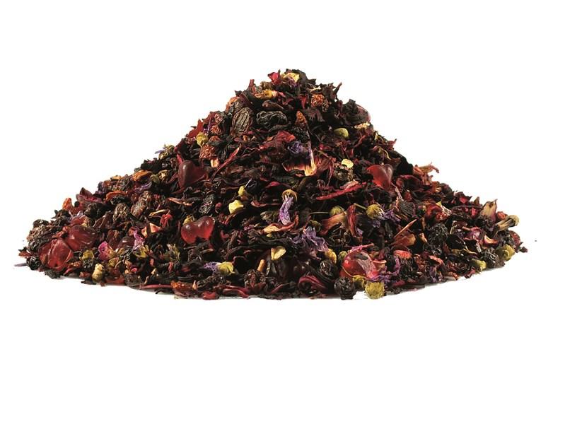 Hibiscus, stafide, jeleuri in forma de inima (sirop de glucoza, zahar, gelatina, acid citric, extracte de plante, aroma, ulei vegetal), fructe soc, kiwi, flori de nalba albastra, aroma