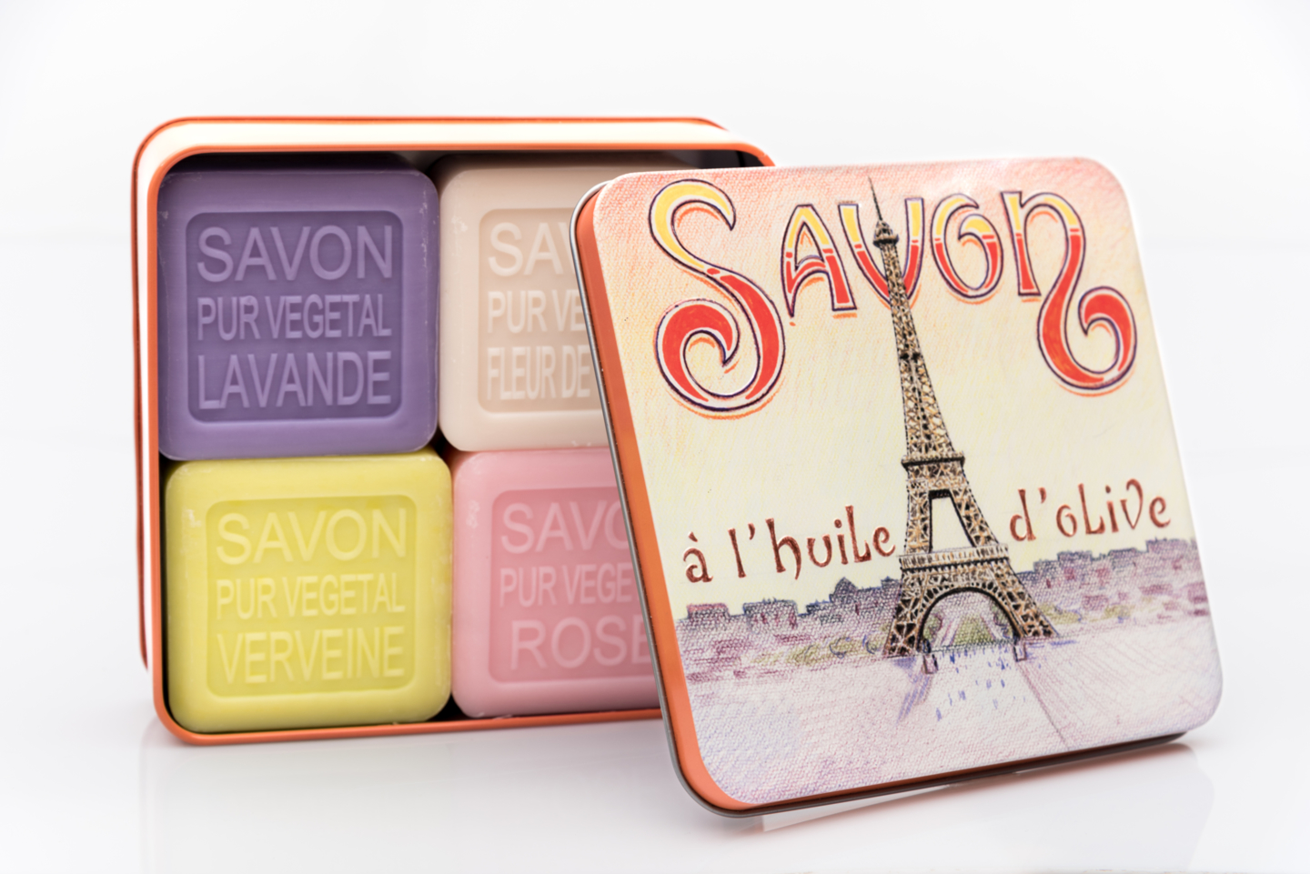Această cutie metalică are patru săpunuri de 100g fiecare, cu miros de Lavanda, Verbena, Trandafir și Bumbac înflorit. Săpunurile sunt îmbogățite cu unt de shea ORGANIC și ulei de măsline Nyons. Aceste două ingrediente au proprietăți hidratante și conferă pielii suplețe.