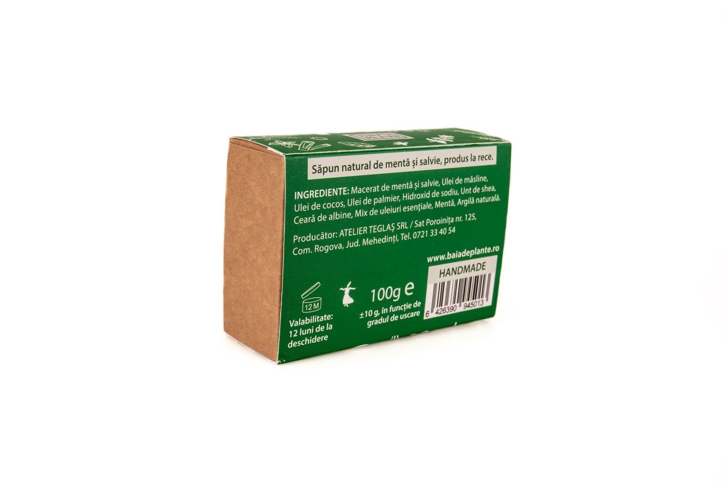 Ingrediente: Macerat de menta si salvie; Ulei de masline; Ulei de cocos; Ulei de palmier; Hidroxid de sodiu; Unt de shea; Ceara de albine; Mix de uleiuri esentiale; Menta; Argila naturala.