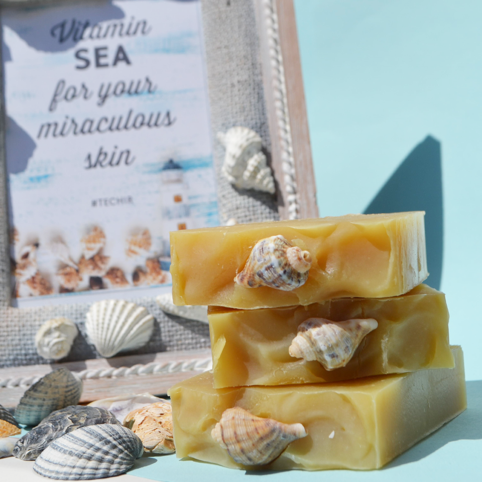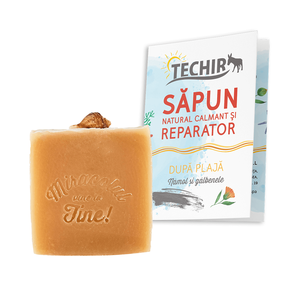 Săpunul calmant şi reparator Techir este un produs natural şi complex, cu ingrediente vegetale ideale pentru îngrijirea pielii afectate de expunerea la soare, datorită efectul său nutritiv.Proprietăţile dermoreparatoare şi calmante oferite de apa salină, nămolul sapropelic din lacul Techirghiol, ceaiul concentrat de gălbenele, uleiul de macadamia, oferă acestui săpun capacitatea de ajuta pielea să se refacă în mod natural, nefiind agresată cu ingrediente chimice şi de sinteză. Uleiurile de măsline şi ricin împreună cu glicerina sunt recunoscute pentru acţiunea hrănitoare la nivelul epidermei, fiind buni umectanţi ce îngrijesc pielea deshidrată.