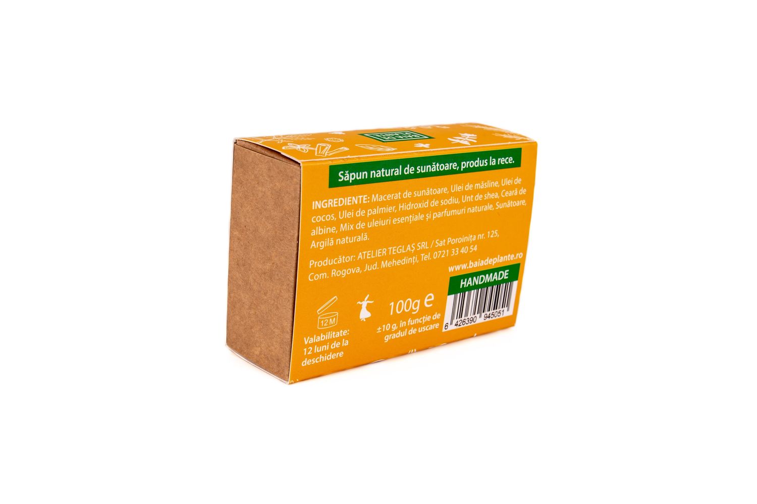 Ingrediente: Macerat de sunatoare; Ulei de masline; Ulei de cocos; Ulei de palmier; Hidroxid de sodiu; Unt de shea; Ceara de albine; Mix de uleiuri esentiale si parfumuri naturale; Sunatoare; Argila naturala.
