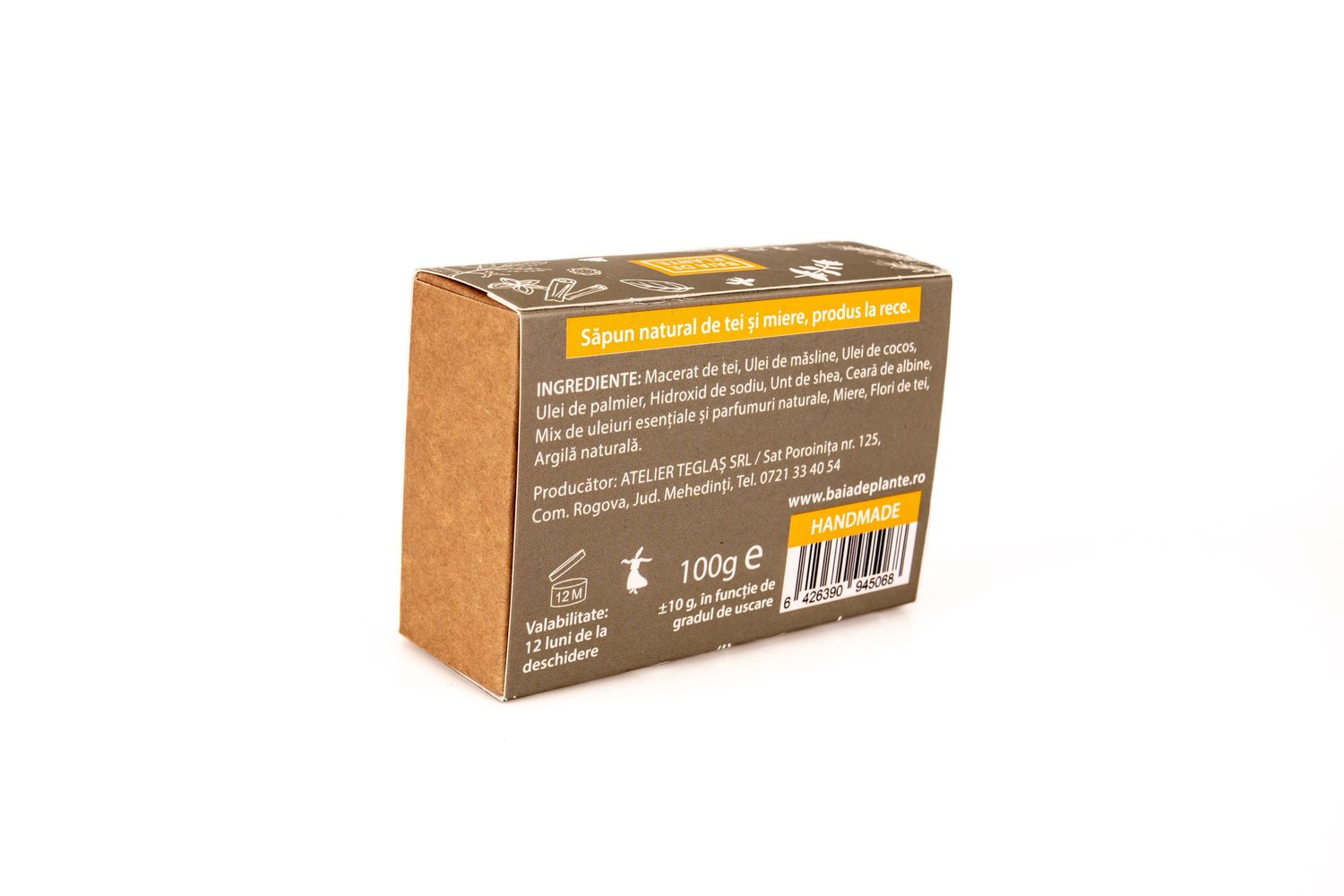 Ingrediente: Macerat de tei; Ulei de masline; Ulei de cocos; Ulei de palmier; Hidroxid de sodiu; Unt de shea; Ceara de albine; Mix de uleiuri esentiale si parfumuri naturale; Miere; Flori de tei; Argila naturala.