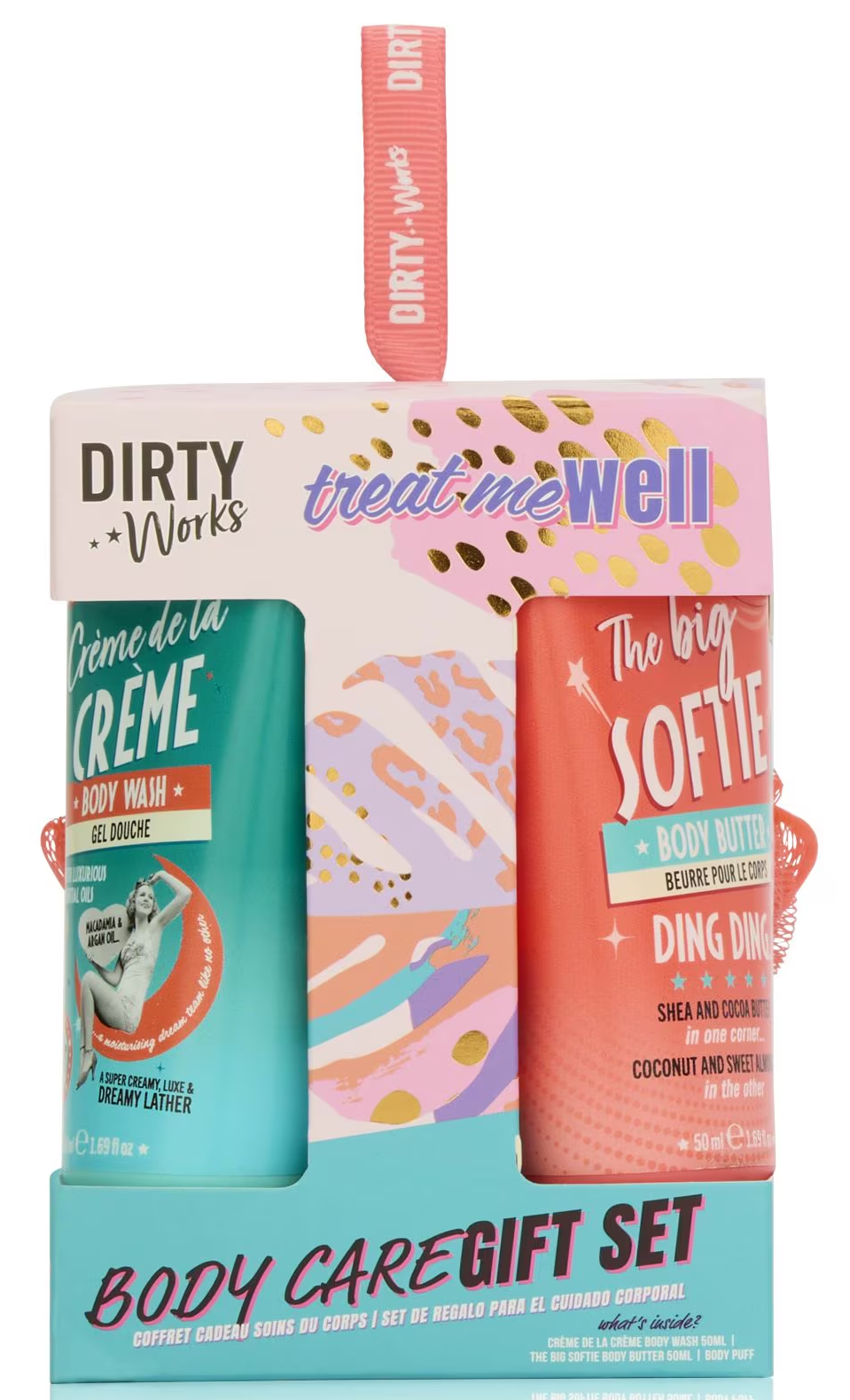 Set ingrijire pentru corp. Pregateste-te pentru cea mai tare sesiune de rasfat Dirty Works. Aceste delicii pentru baie si corp vor lasa cu siguranta pielea curata si hidratata! Tot ce ai nevoie pentru a te rasfata cu adevarat! Contine: 50ml gel de dus- cu uleiuri esentiale luxoase de nuci de macadamia si ulei de argan, 50 ml unt de corp pentru a combate pielea uscata cu ingrediente hidratante-unt de shea si unt de cacao pe o parte si ulei de cocos si ulei de migdale dulci pe alta , burete de baie.