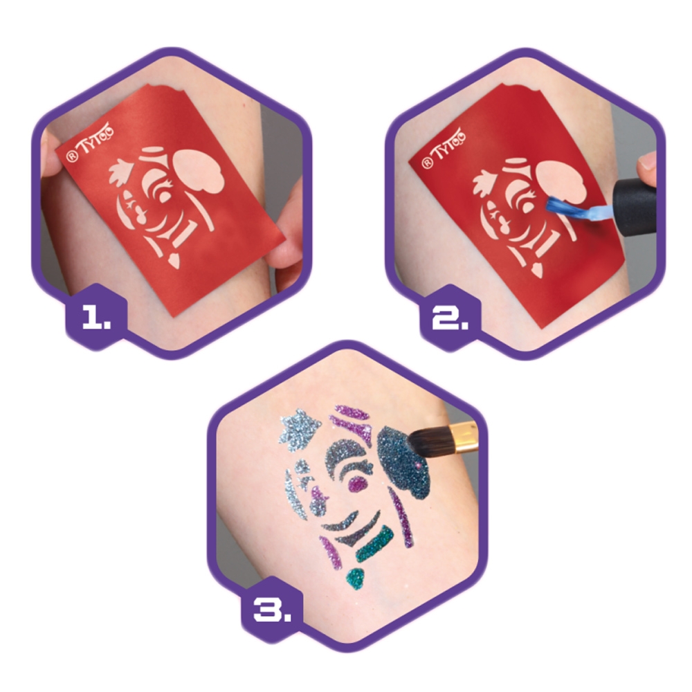 - Instructiuni utilizare: mai intai, spalati si uscati pielea, alegeti un sablon si lipiti-l pe pielea curata. Apoi aplicati adeziv pe piele, desprindeti sablonul si il puteti decora cu pudra cu sclipici.