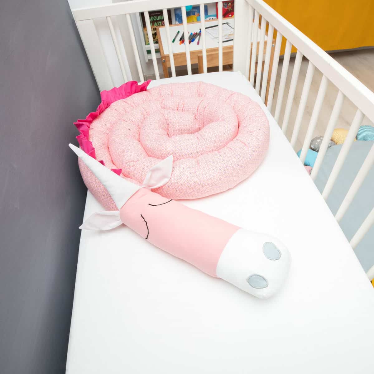 Aparatoarea este o protectie de patut pentru bebe care il protejeaza pe cel mic de lovituri. Unicornul este o perna tubulara, lunga, ce inconjoara toate laturile patutului. Culoarea predominanta este roz, fiind potrivit pentru o fetita. Este confectionat 100% din bumbac si umplut cu umplutura hipoalergenica.
