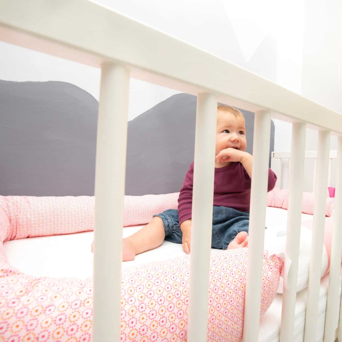 Unicornul inconjoara tot patutul si apoi se aseaza linistit. Desi pare adormit, unicornul perna de fapt protejeaza discret, ca micuta ta sa fie in siguranta si sa nu se loveasca.