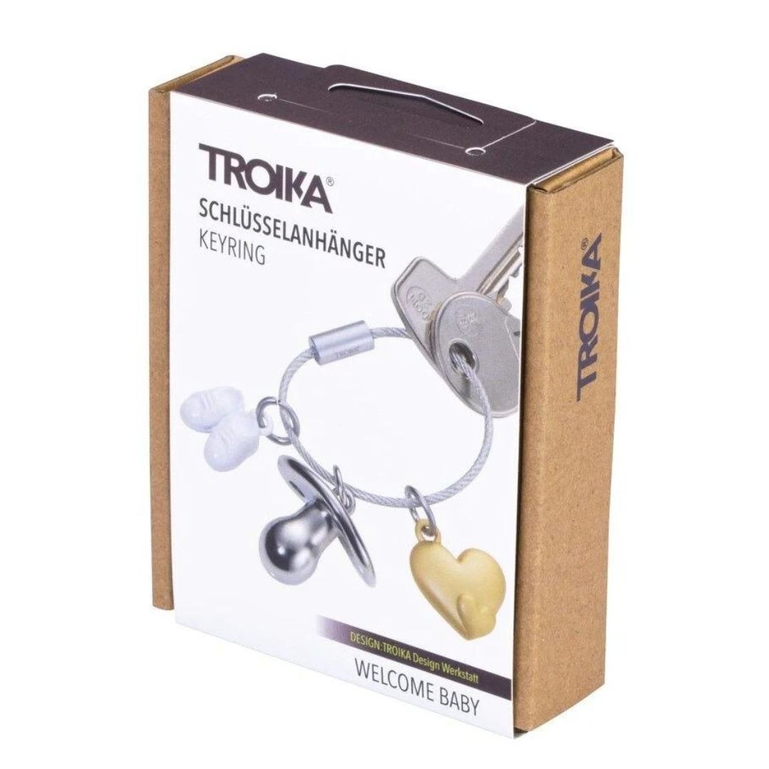 Brelocul pentru chei de la Troika este realizat din metal cu aspect lucios, în culori alb cu auriu.