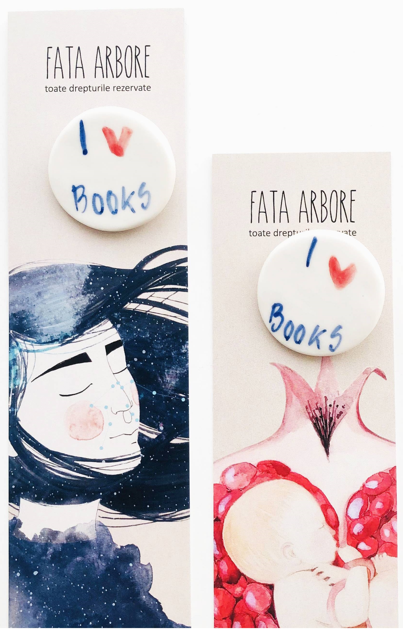 Broșă I LOVE BOOKS din porțelan, decorată cu pigmenți ceramici.