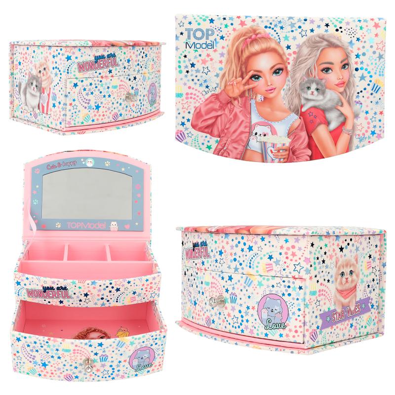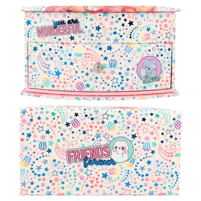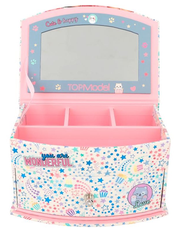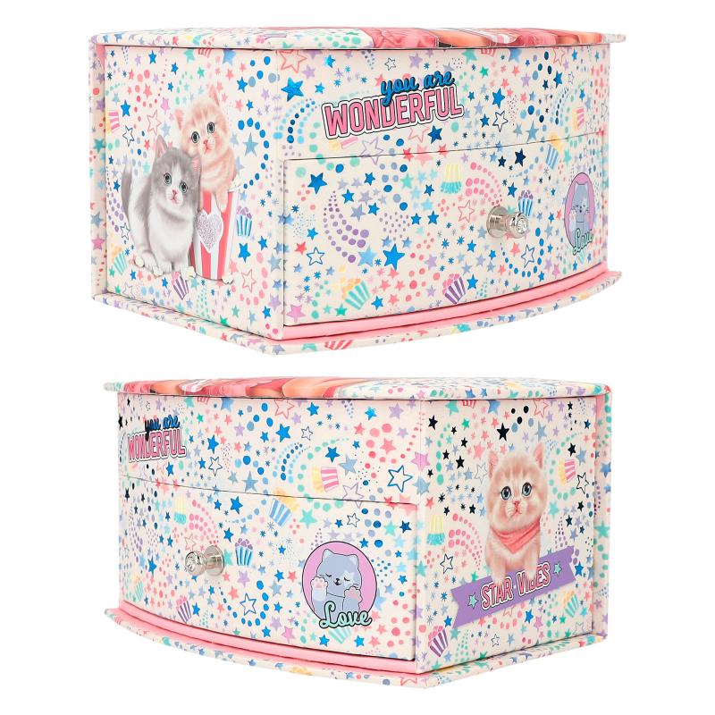 Cutie de bijuterii pentru fetițe decorată cu pictograme distractive cu floricele de porumb, pisoi drăguți și steluțe. Are o oglindă în capacul cu clapă, un compartiment principal divizat și un sertar mare cu un ștras pe mâner.