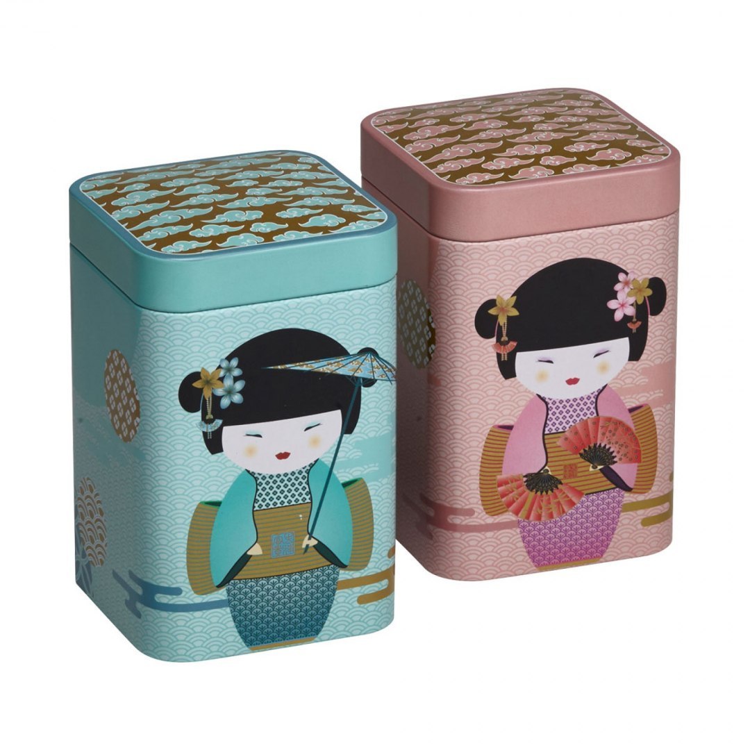 O cutie din inox pentru depozitat ceaiul și cafeaua, decorată cu o gheișă și alte motive tradiționale japoneze.