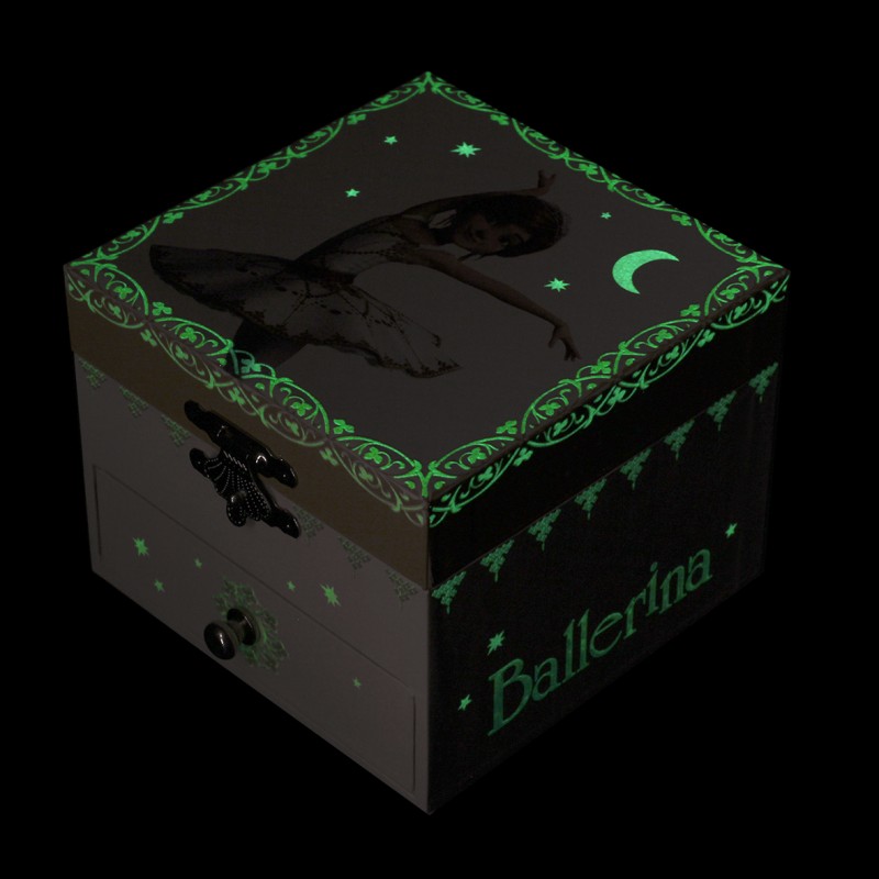 Această cutie muzicală este fosforescentă! Când este încărcată de lumina zilei, strălucește în noapte pentru cea mai mare fericire a copiilor.