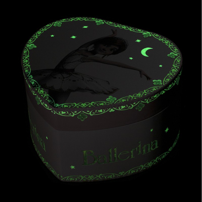 Această cutie muzicală este fosforescentă! Când este încărcată de lumina zilei, strălucește în noapte.