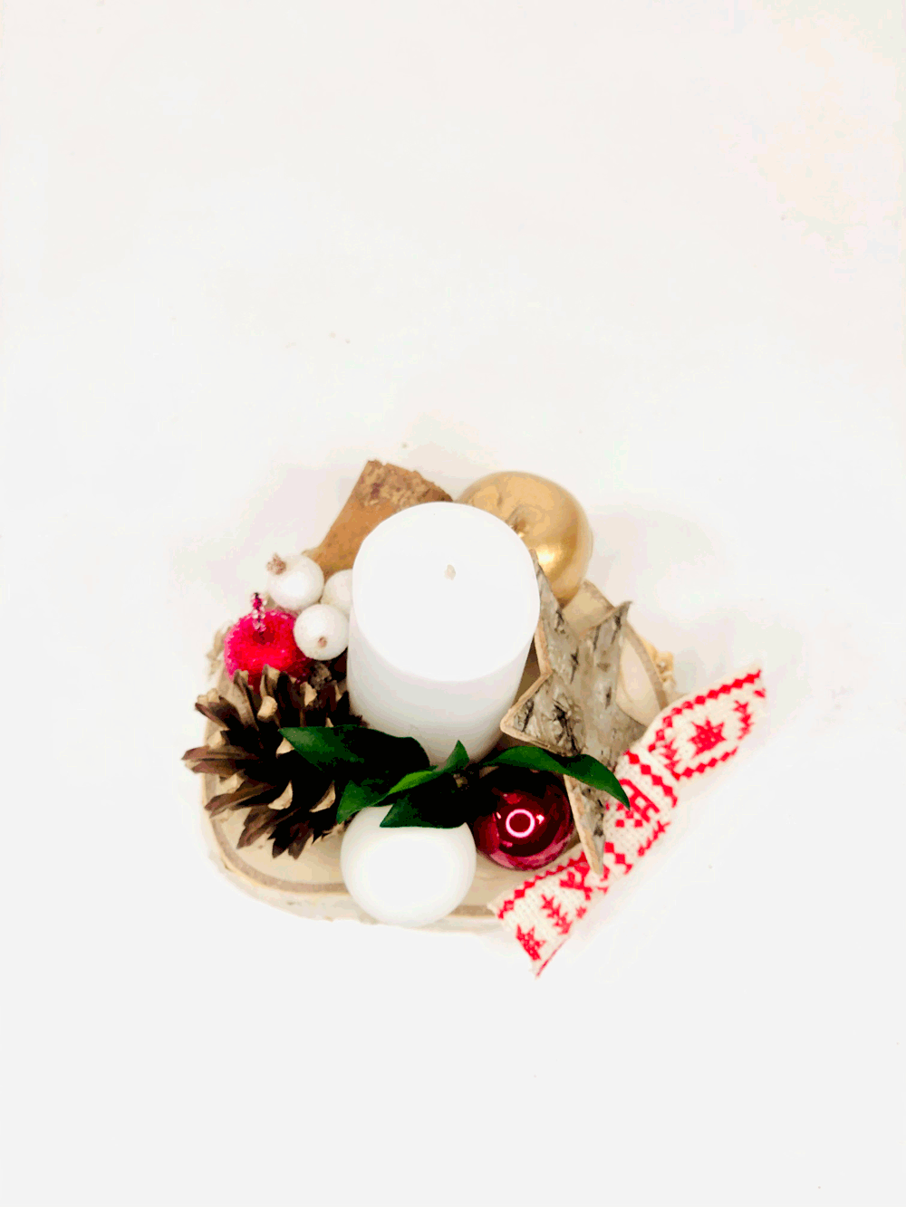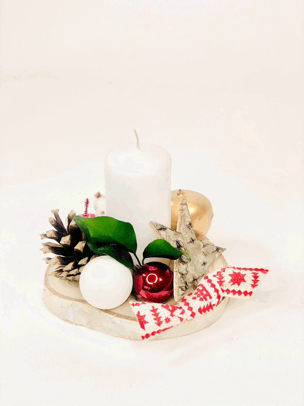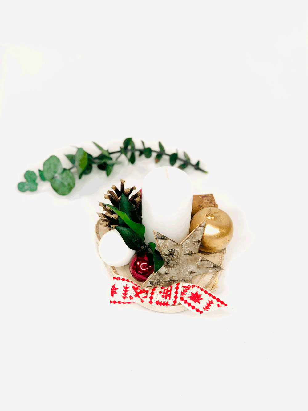 Decorațiune pentru Crăciun, alcătuită dintr-o lumânare albă așezată pe o bază din lemn, cu mici ornamente specifice sărbătorilor.