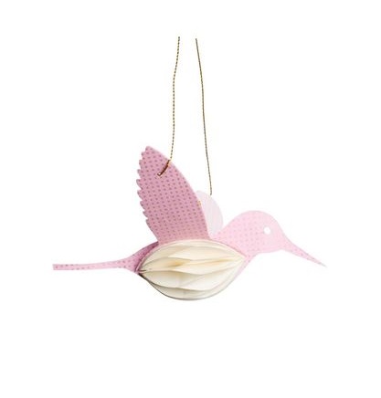 Decoraţiune în formă de pasăre de culoare roz, pliabilă, dotată cu agăţătoare, lucrată manual din hârtie reciclată, pentru împodobit ramurile și ferestrele în toate anotimpurile.