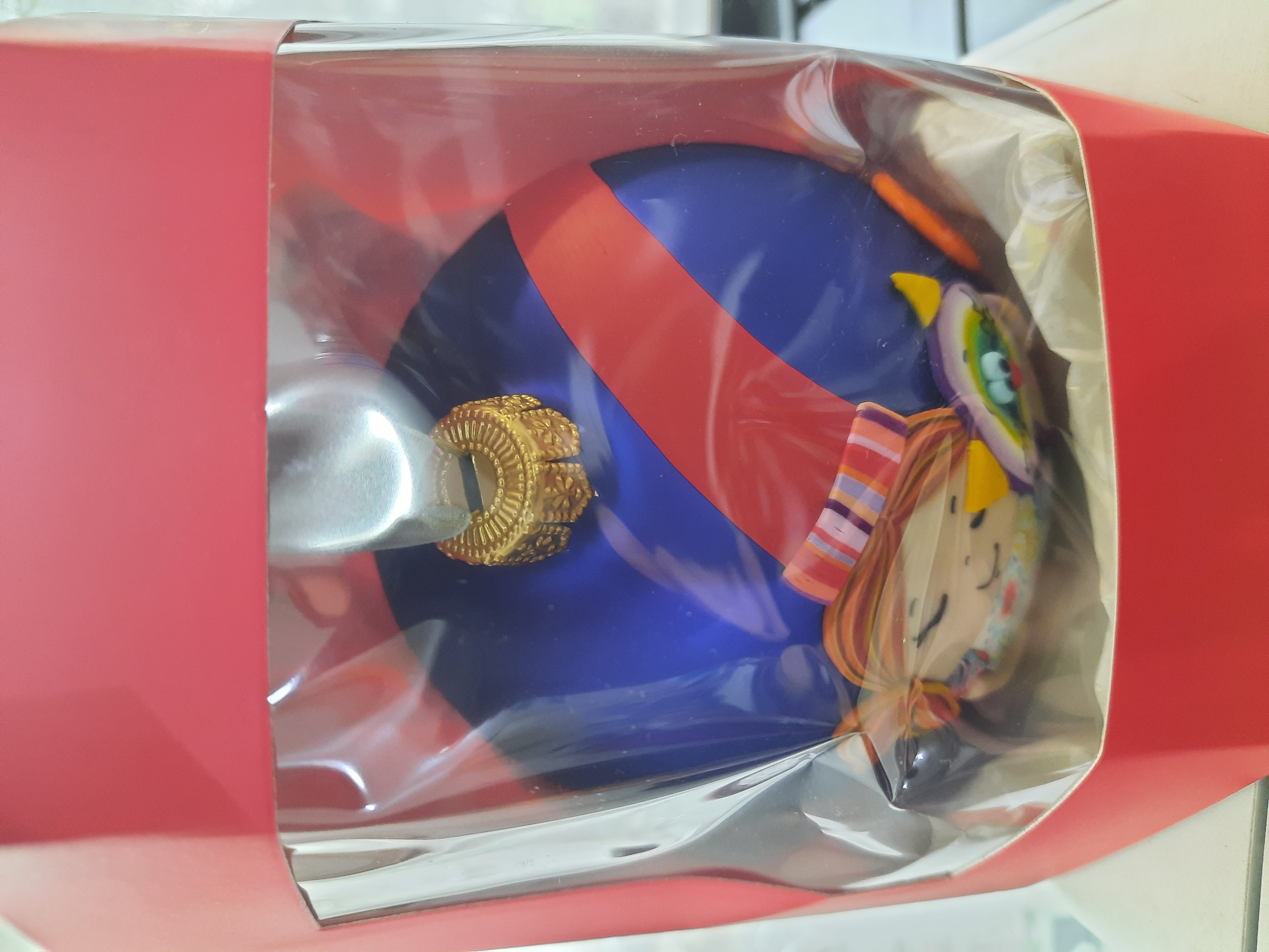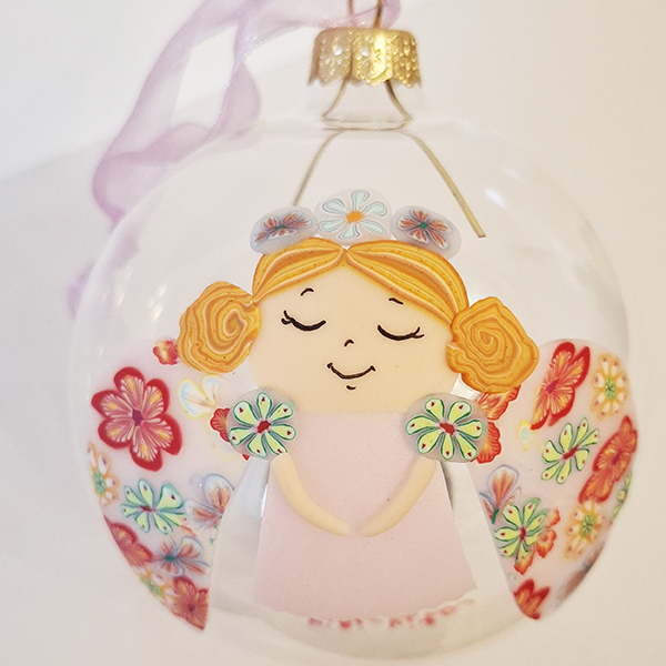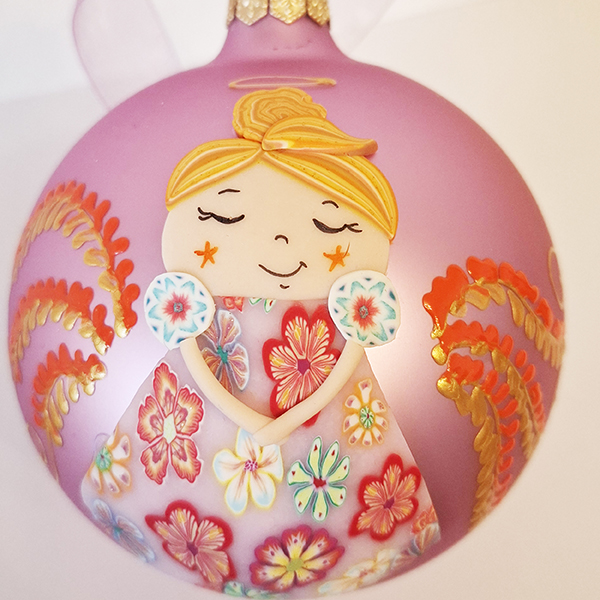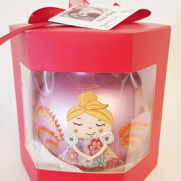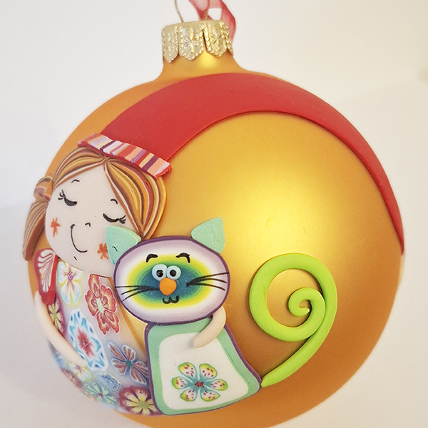 Glob de Crăciun cu fetita si pisica, decorat manual cu pastă polimerică, suflat din sticlă și colorat artizanal la Sibiu. Globurile fiind realizate manual în serie mică, pot să apară mici variații de forme și nuanțe față de imaginea de referință